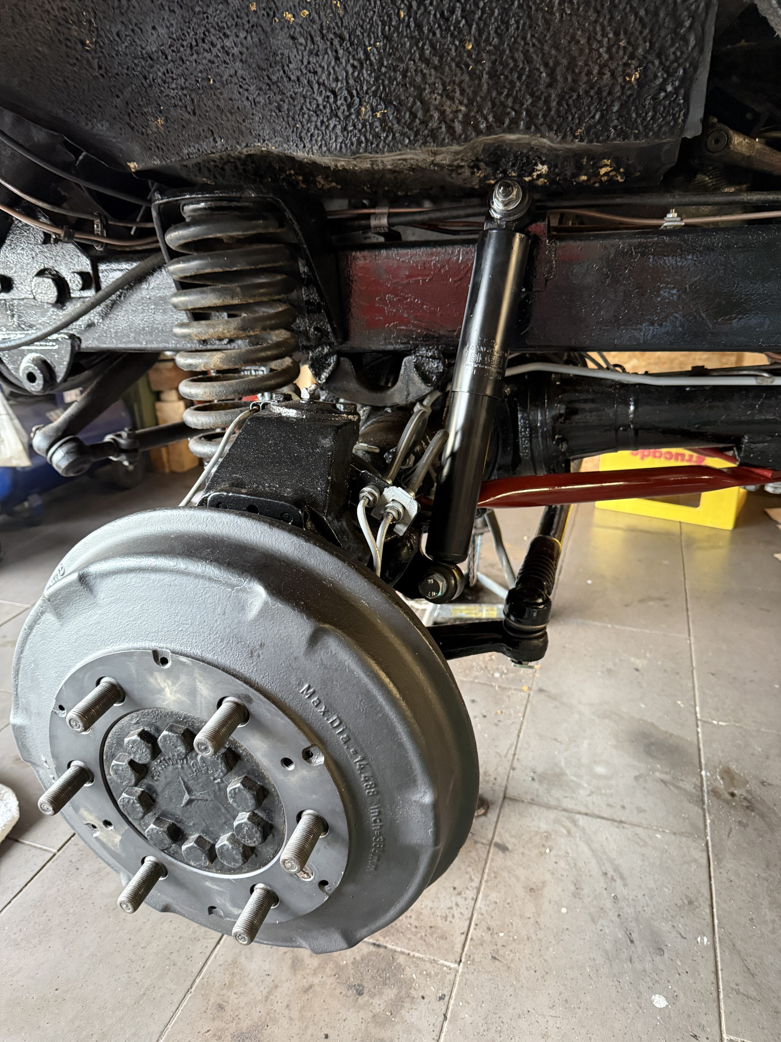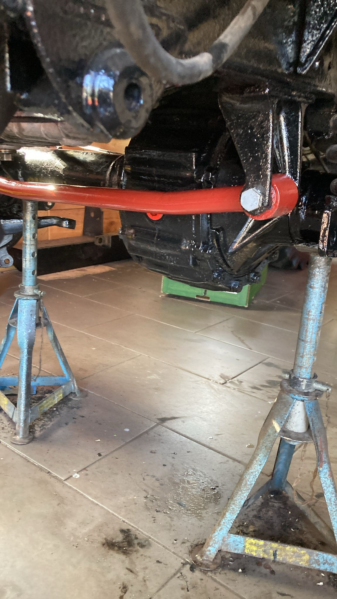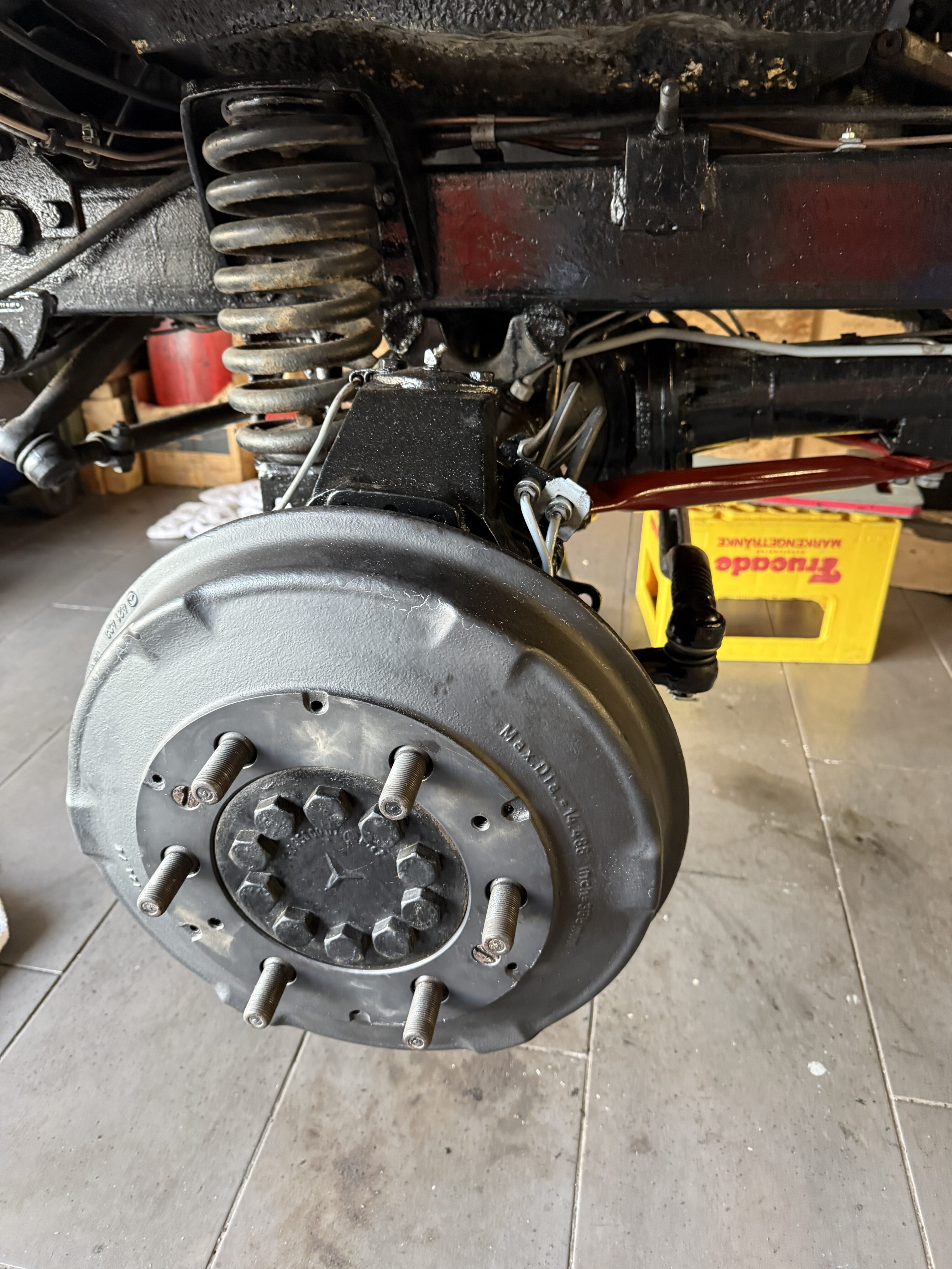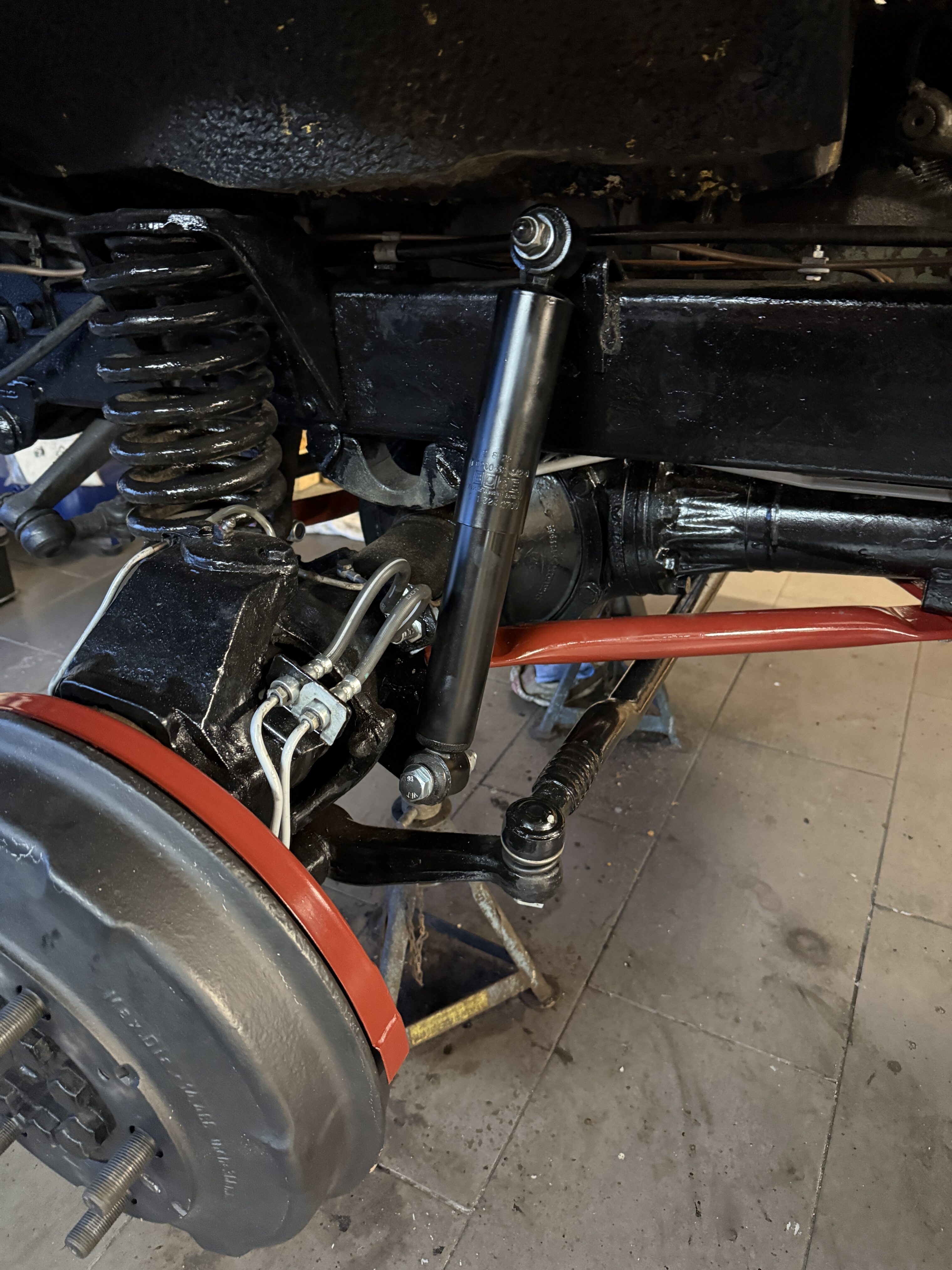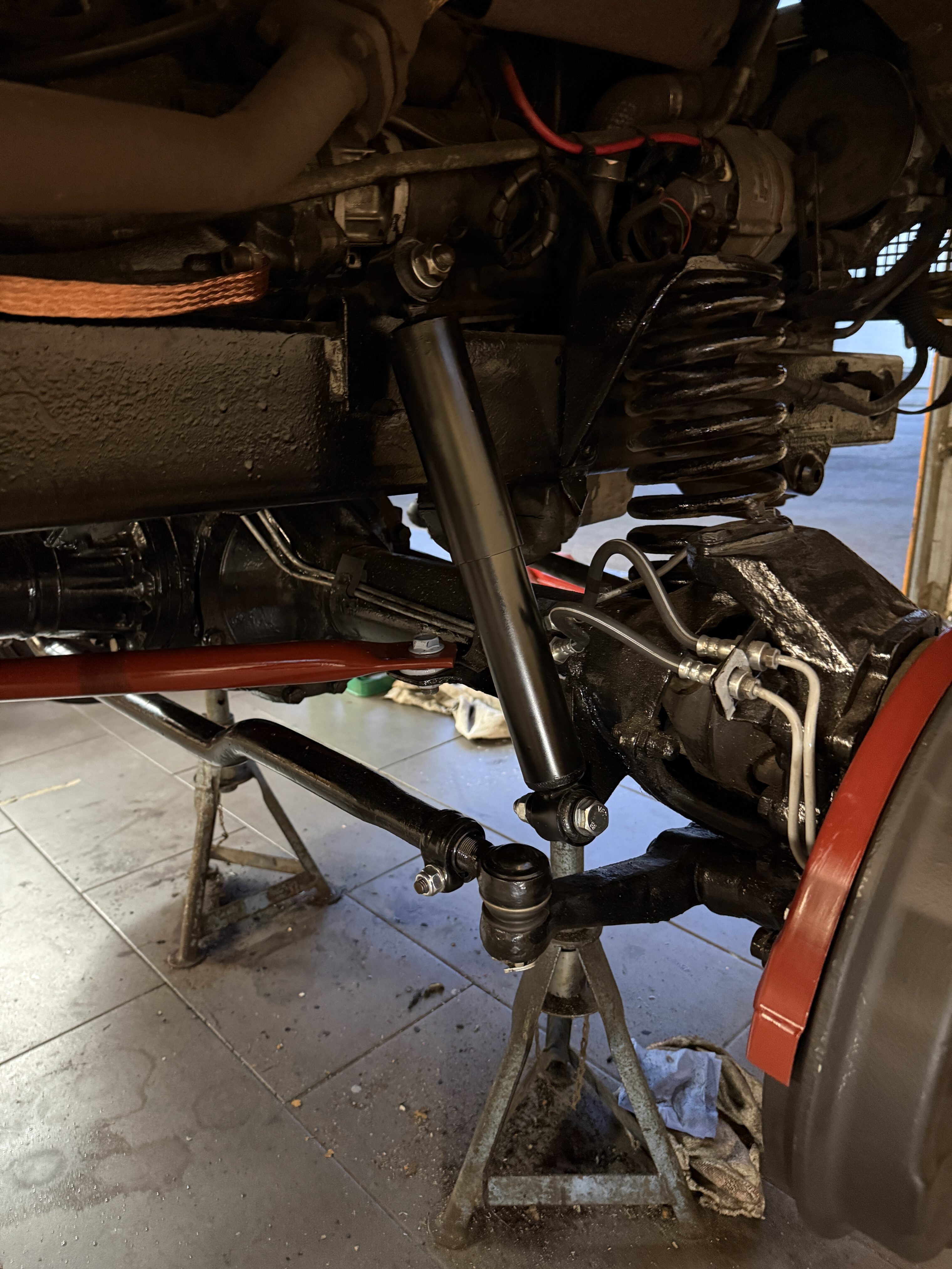 Die Schubstreben sind lackiert und bereit für den Einbau. Zusammen mit der Spurstange und den Stoßdämpfern werden sie wieder montiert, sobald die Leitungsarbeiten im vorderen Bereich vollständig abgeschlossen sind. Ohne diese Bauteile ist der Zugang derzeit deutlich einfacher.