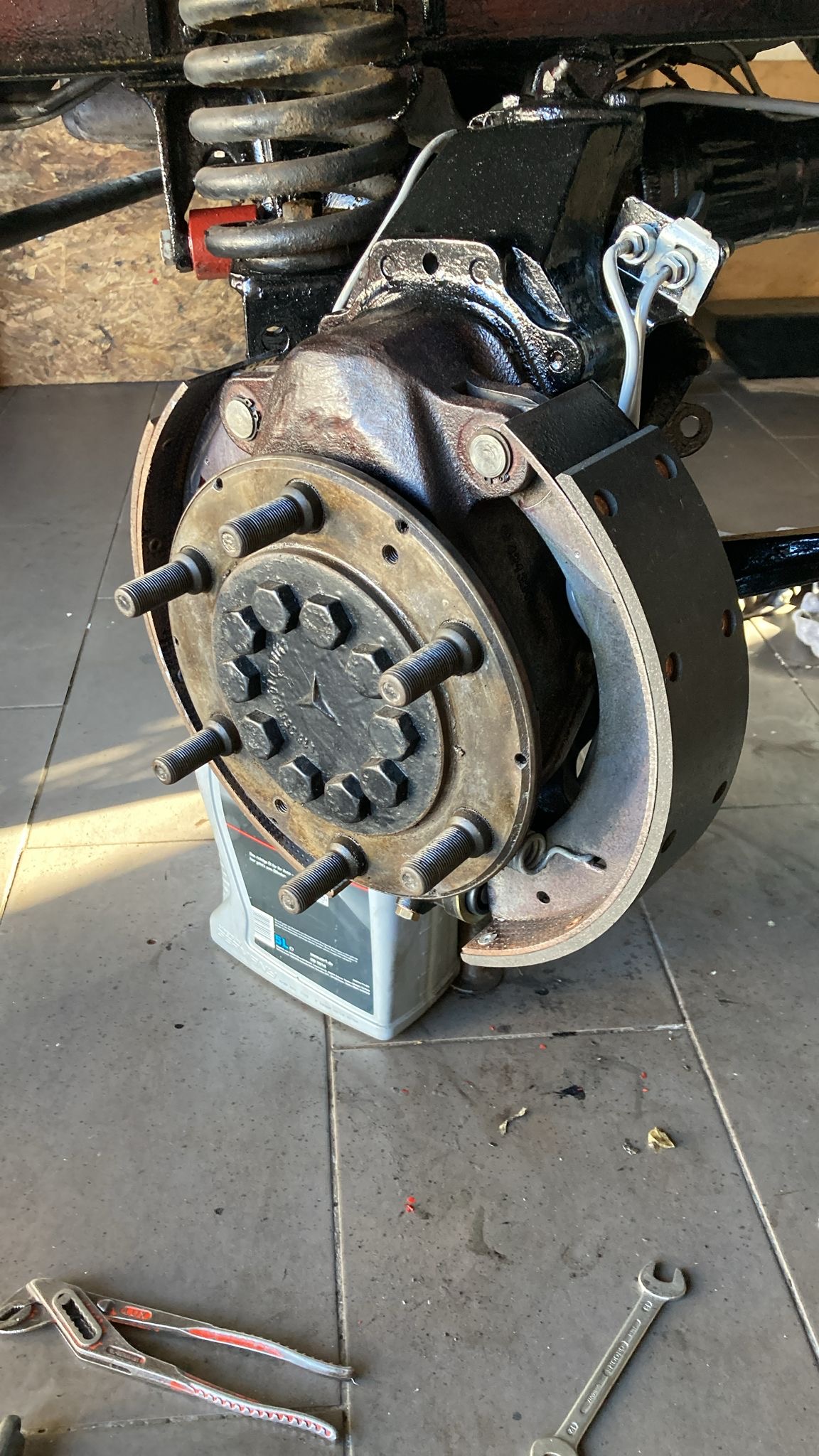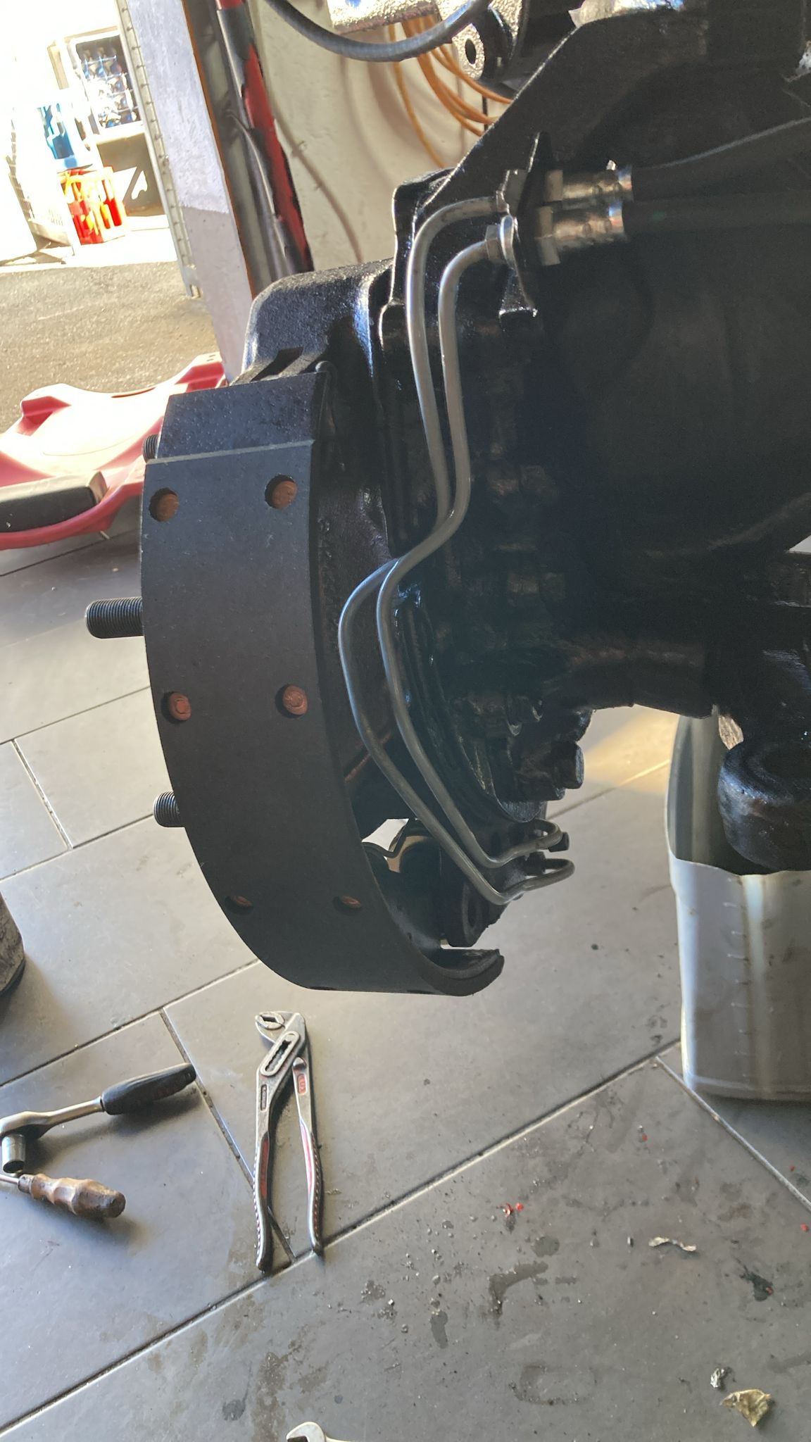 Die vordere Bremse wurde wieder zusammengesetzt. Die Radbremszylinder sind montiert, Bremsleitungen und Bremsschläuche angeschlossen. Zudem wurden neue Bremsbeläge aufgenietet.