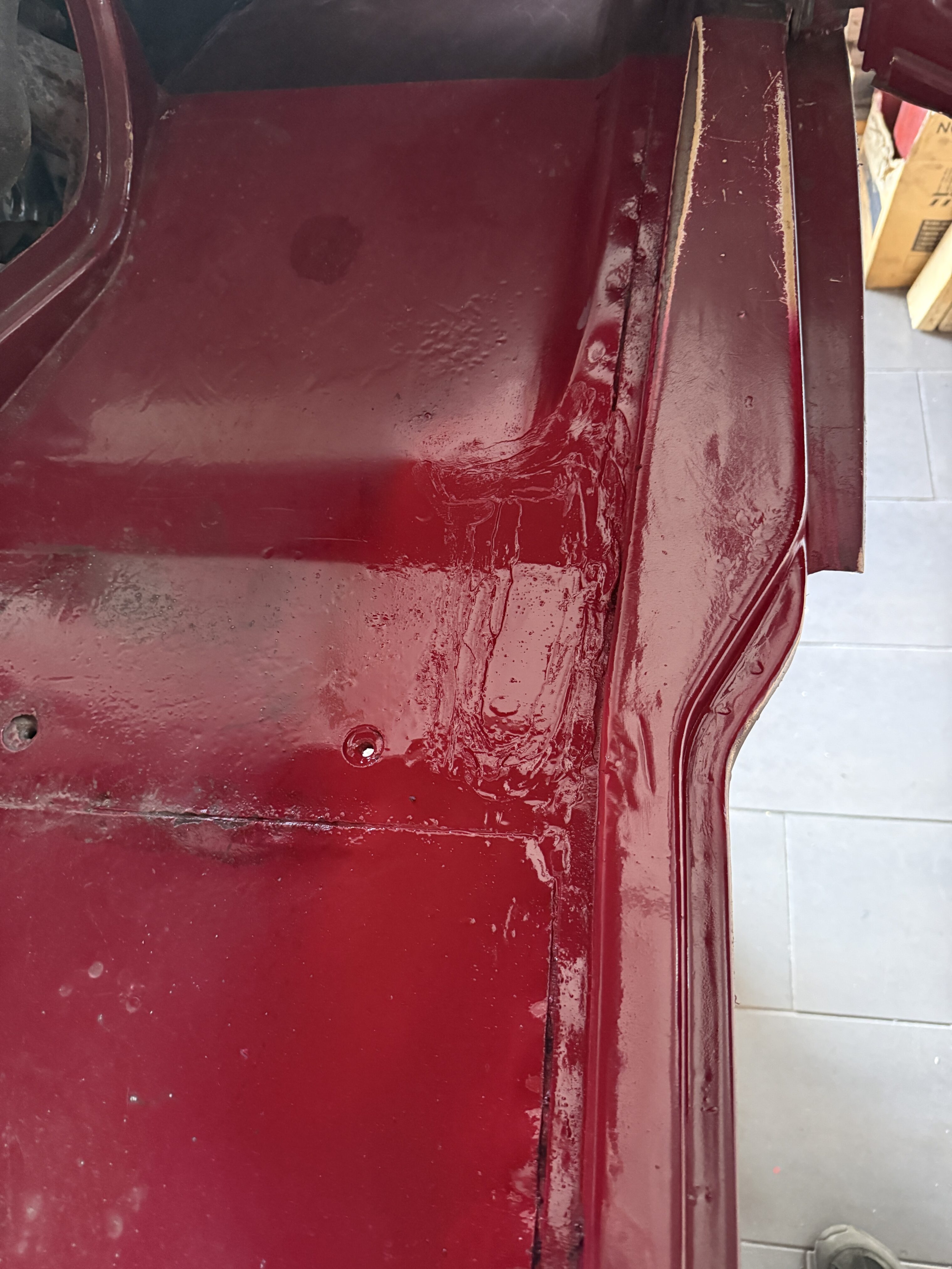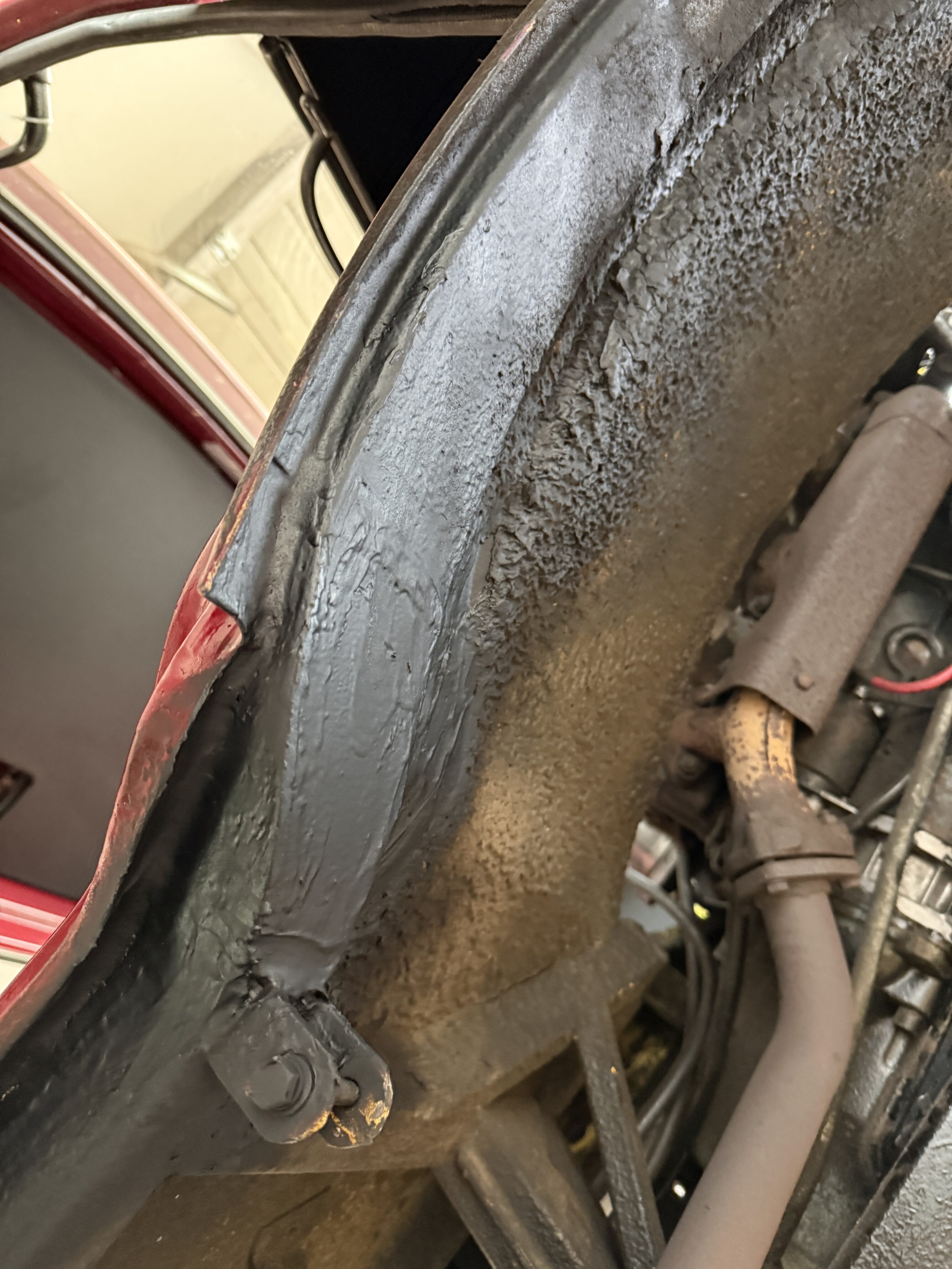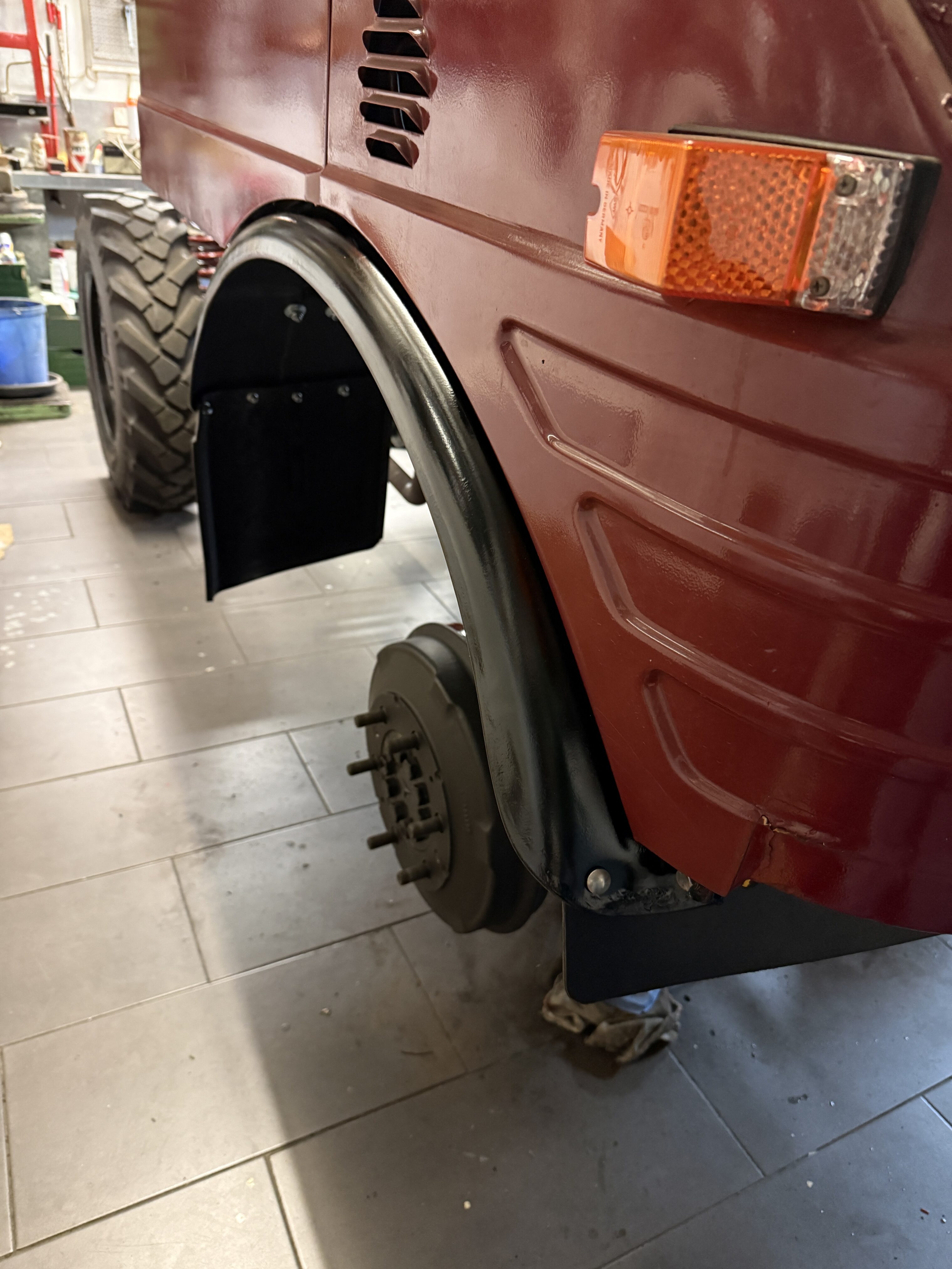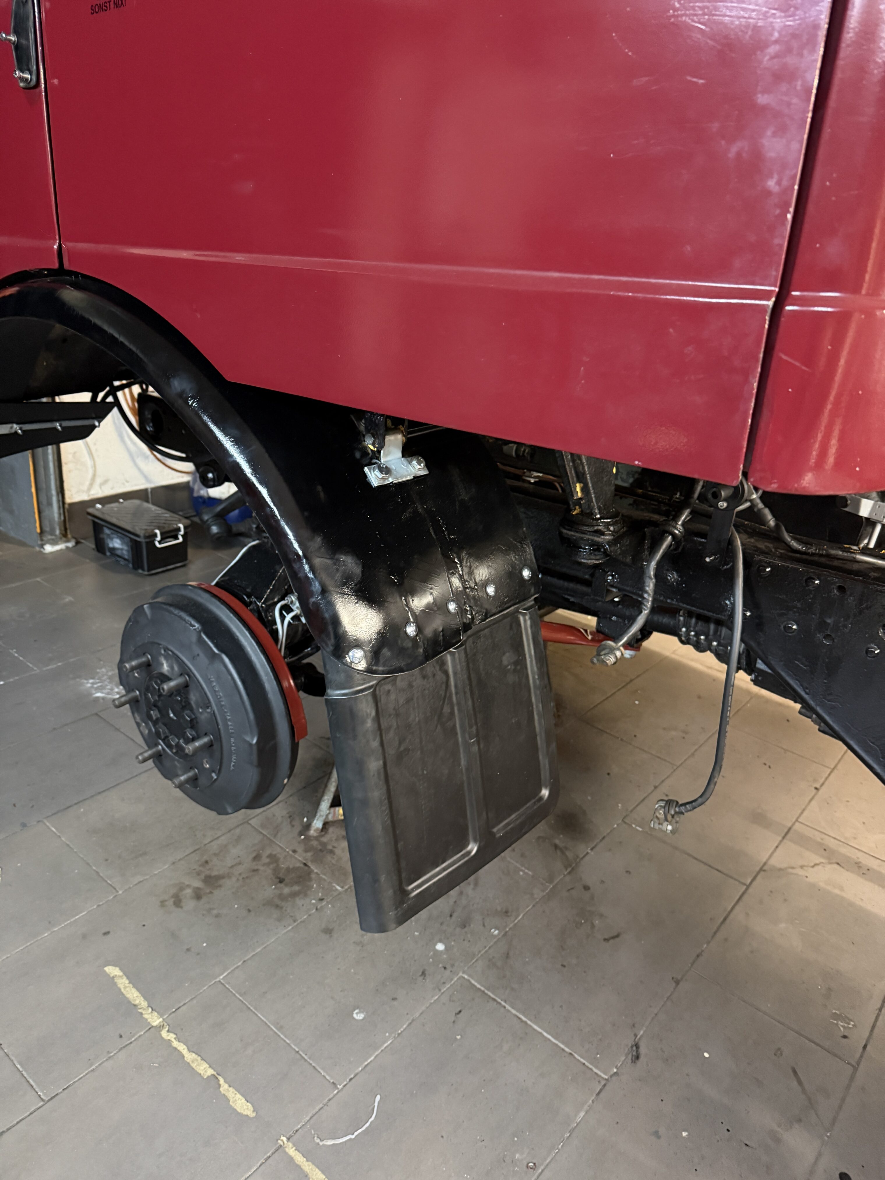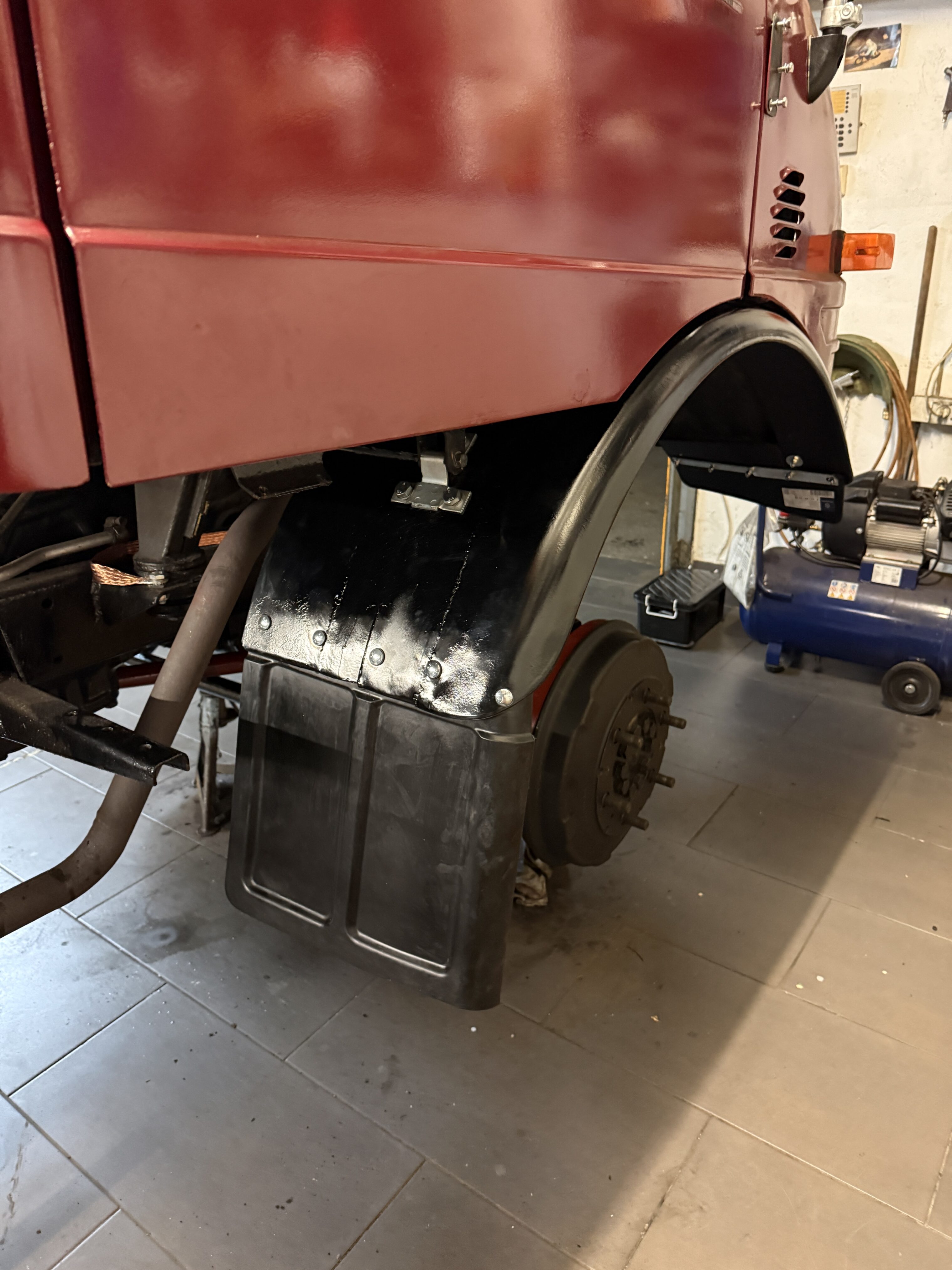 Die aufwendig restaurierten vorderen Kotflügel konnten nun mit neuen Spritzschutzgummis ausgestattet und wieder eingebaut werden. Eine tolle Arbeit!