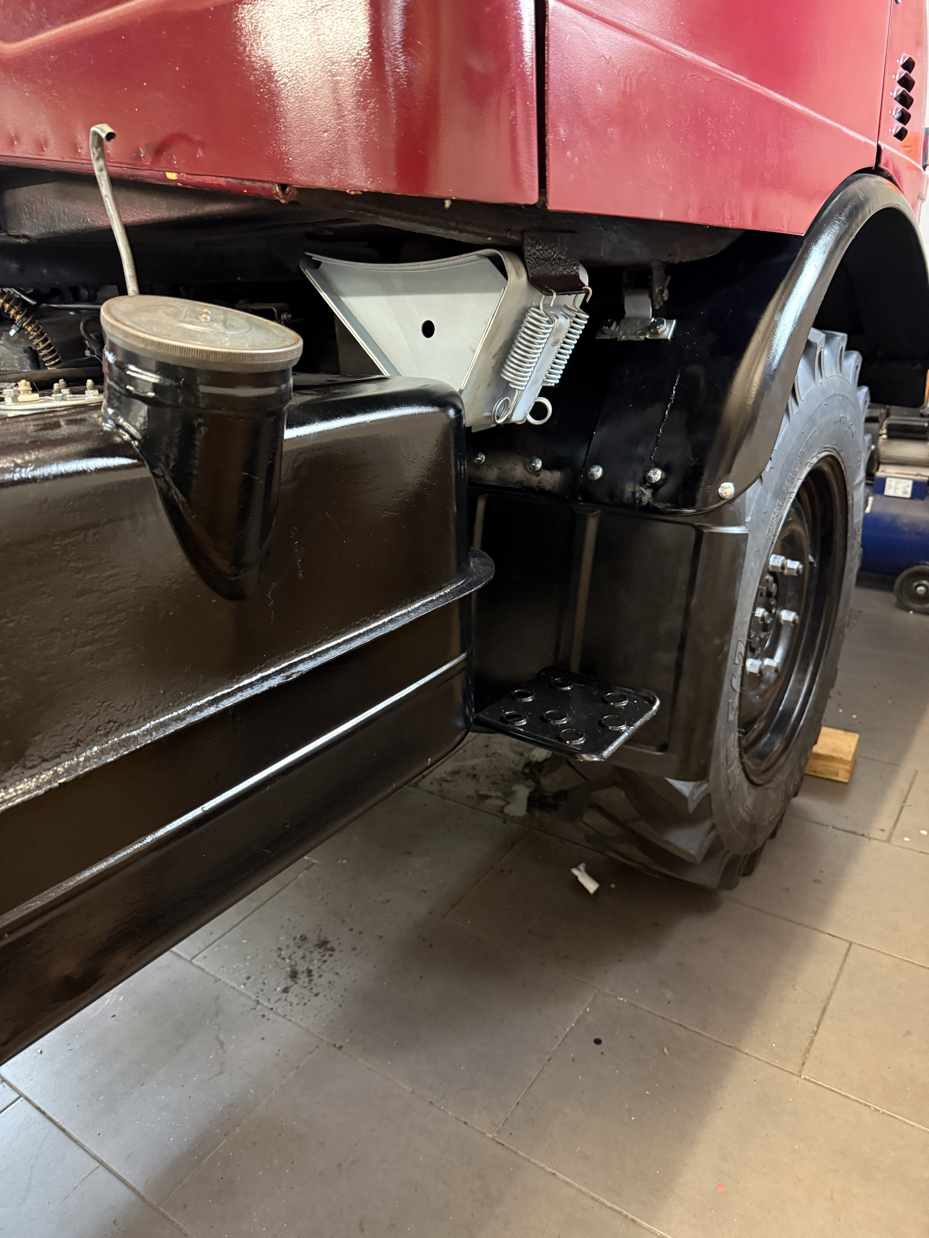 Nachdem die Arbeiten an der Vorderachse mit allen Leitungen, der Bremsanlage sowie den Ölen abgeschlossen sind, wurden die Räder wieder montiert.