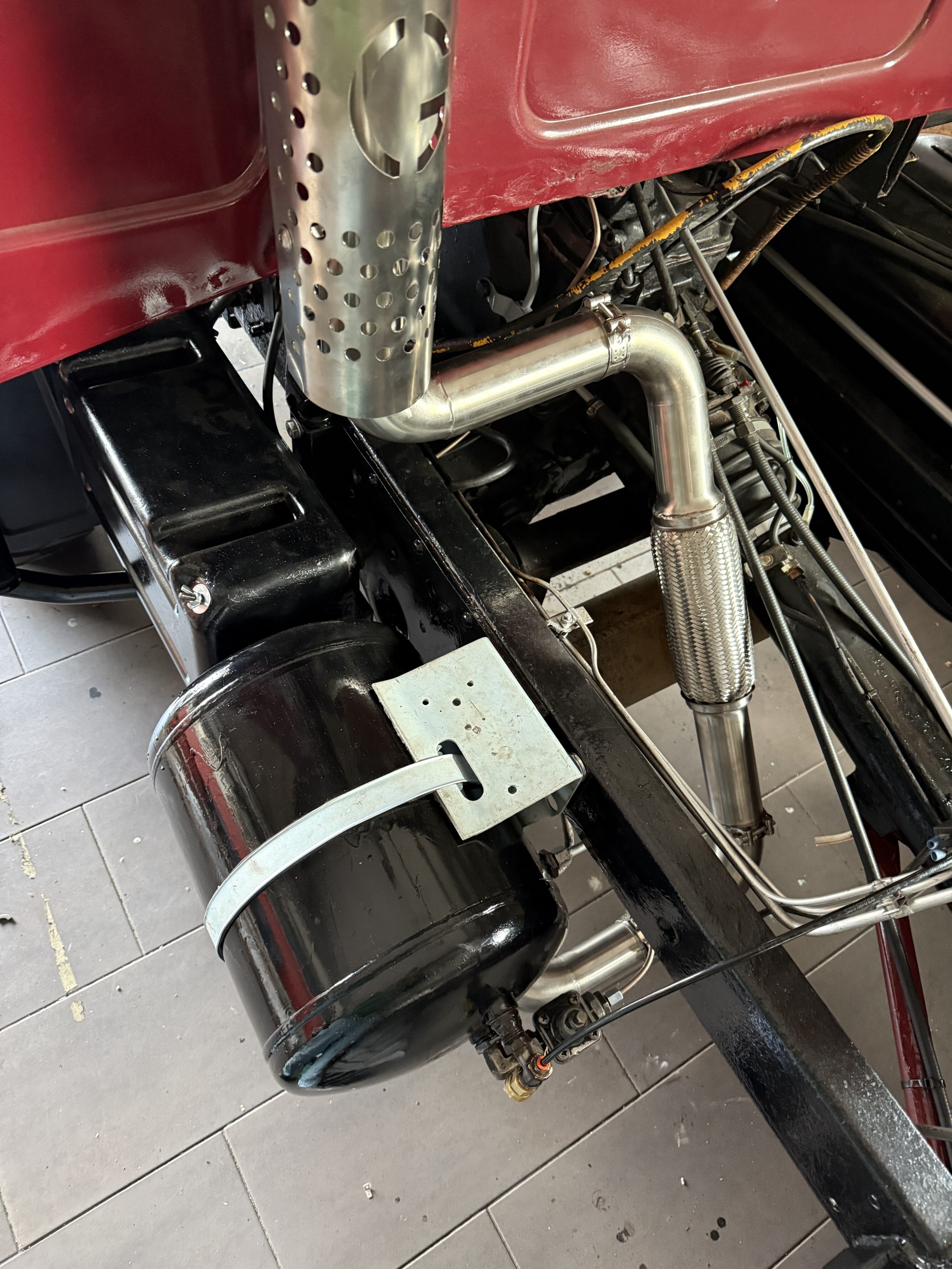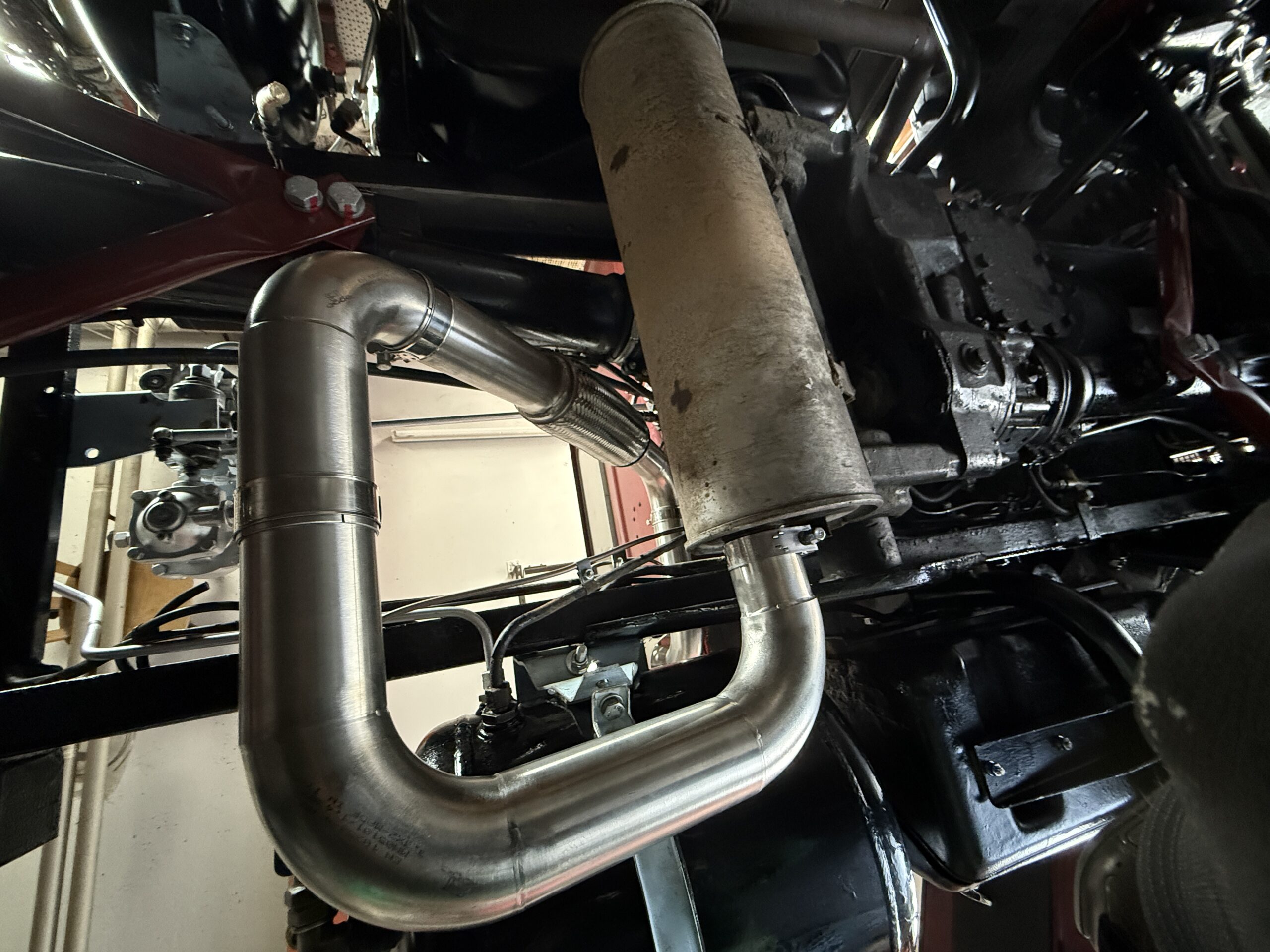 Da die bisherige Auspuffhochlegung hinsichtlich der Rohrführung nicht optimal ausgeführt war, wurde eine neue Hochlegung aus Edelstahl beschafft und montiert.
