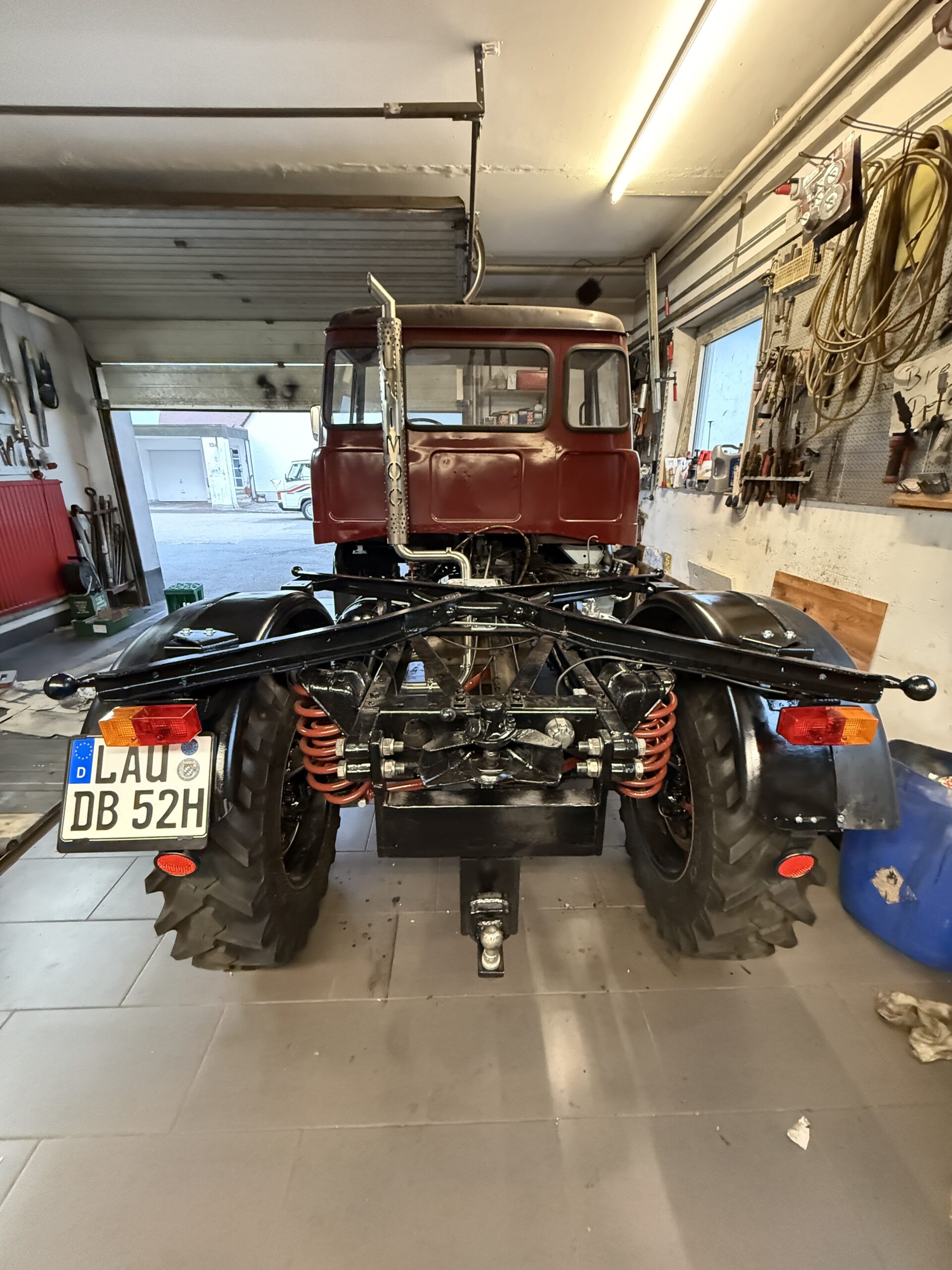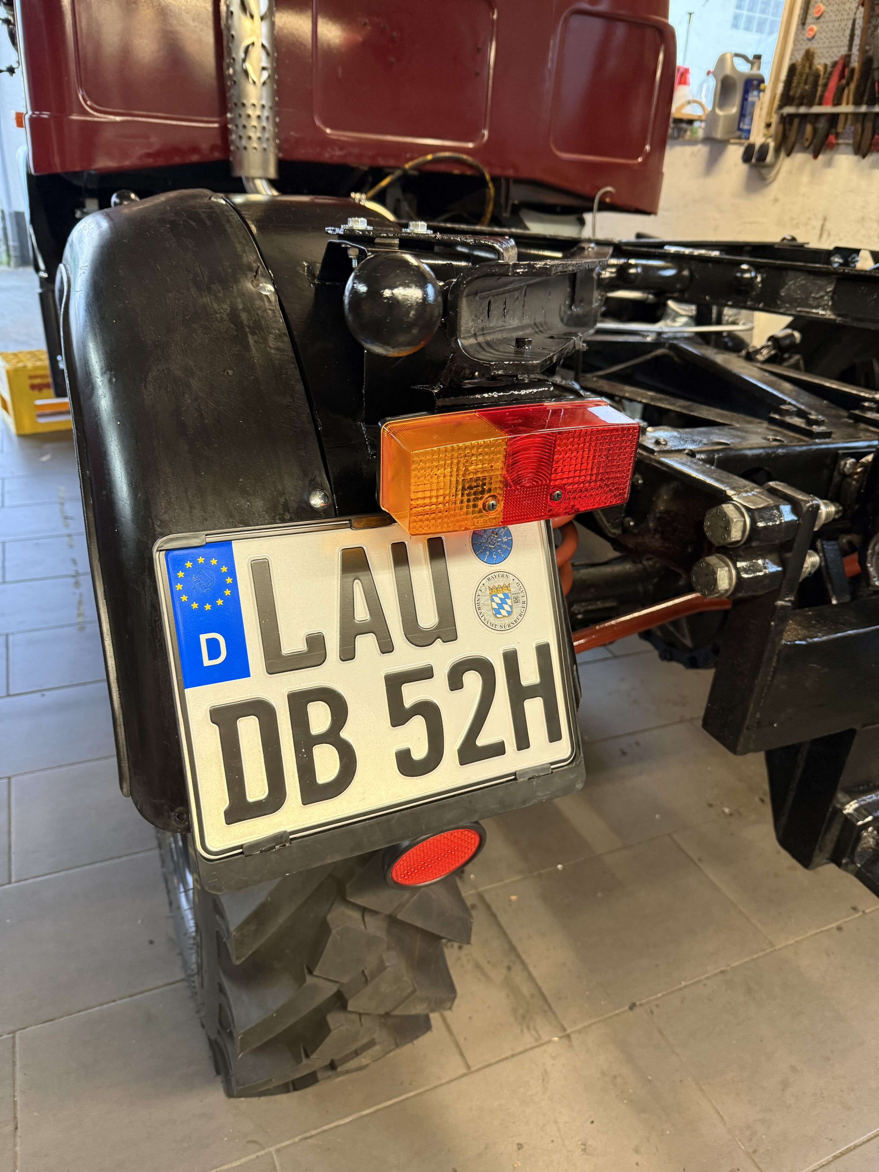 Da die Kipperspinne wieder montiert ist, konnten auch die neuen Rückleuchten angeschlossen und erfolgreich getestet werden. Zudem wurden die hinteren Kotflügel montiert sowie die Katzenaugen und das Kennzeichen wieder angebracht.
