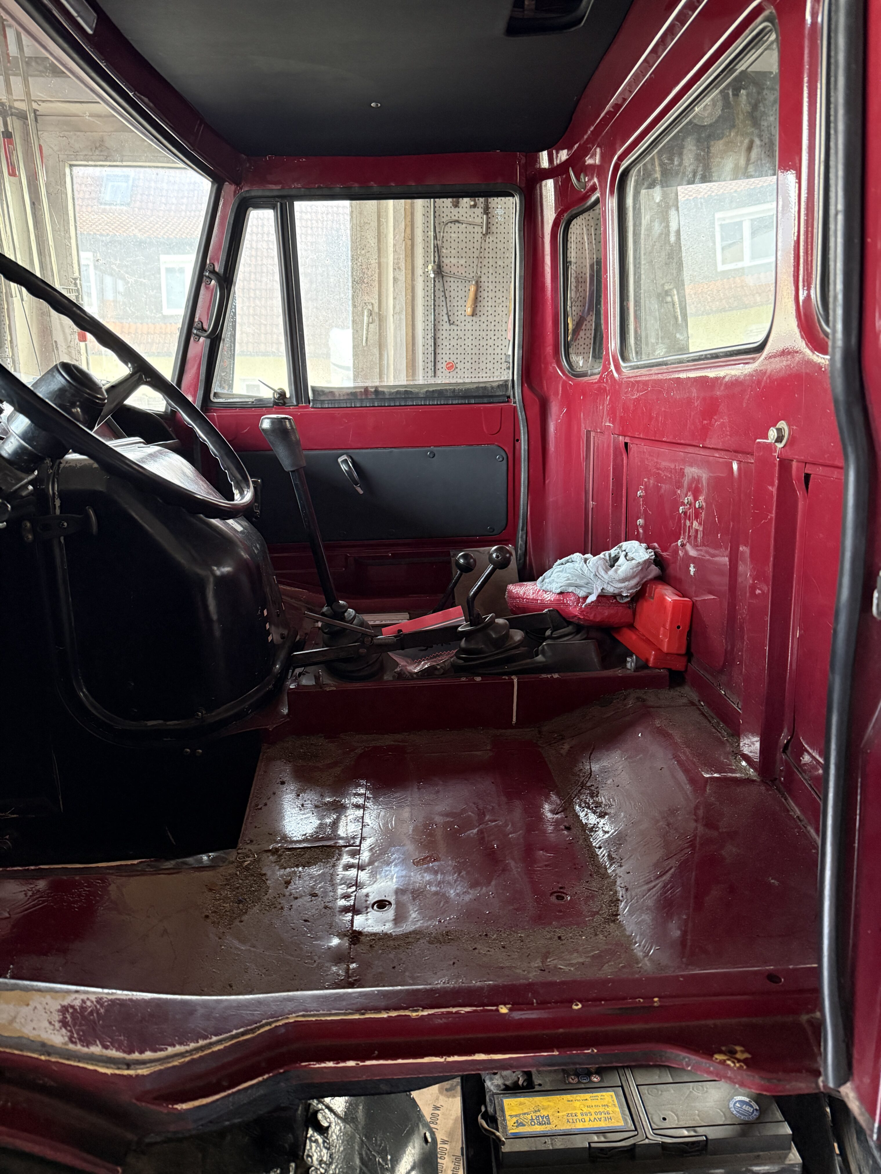Auch im Fahrerhaus schreiten die Arbeiten voran. Der Fahrer- und der Beifahrersitz wurden ausgebaut und werden vollständig neu aufgebaut. Dazu gehören eine neue Lackierung der Sitzgestelle, die Aufarbeitung bzw. Erneuerung der Polsterung sowie ein neuer Stoffbezug.