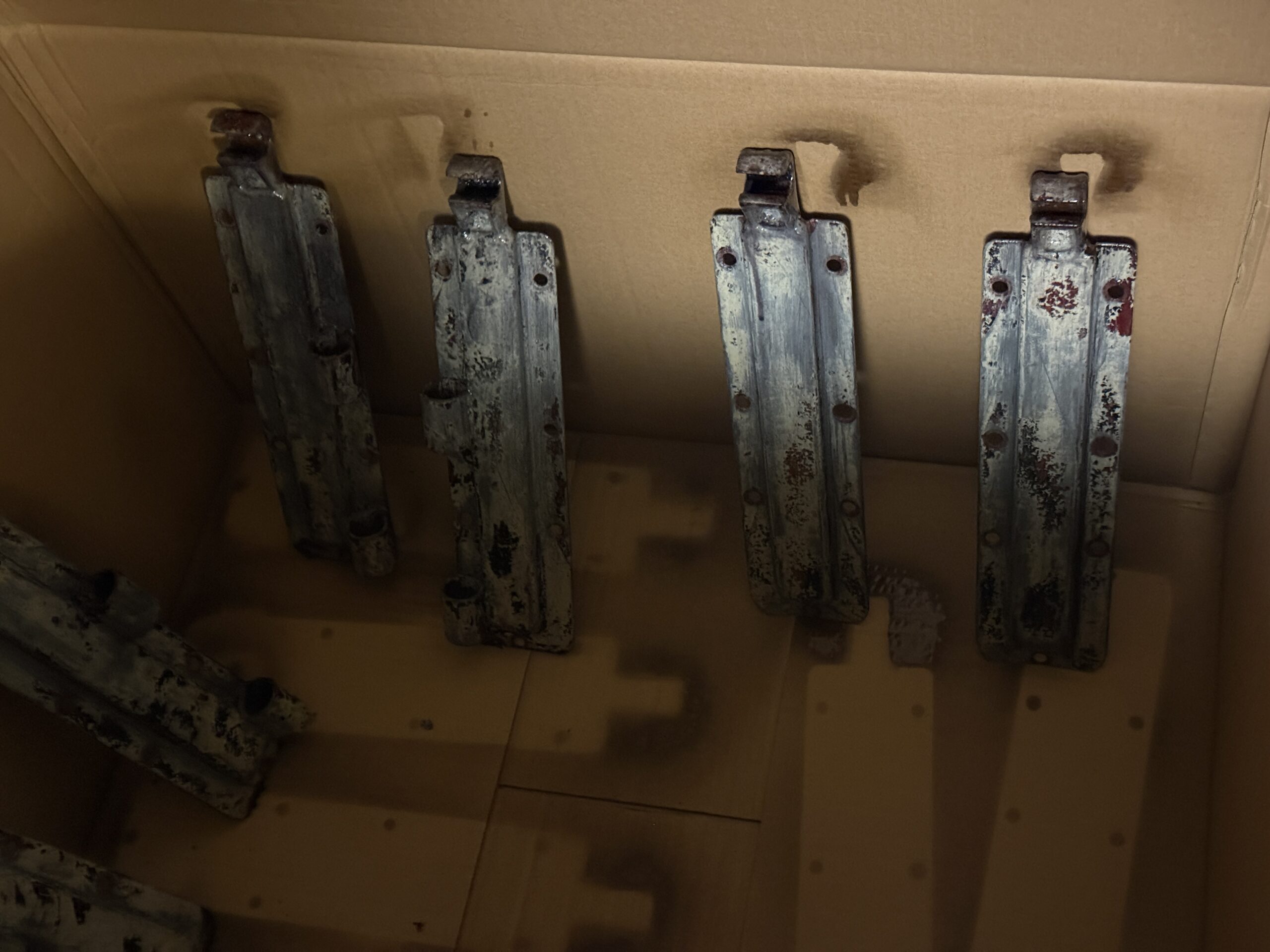 Beschläge und Scharniere wurden mit Beize von ihrer alten Farbe befreit und anschließend mit Rostumwandler für die Lackierung vorbereitet. Die Bordwände sind bereits grundiert und warten nun ebenfalls auf ihre Lackierung. Schrauben und Verschlussketten werden im Zuge der Aufarbeitung vollständig erneuert.