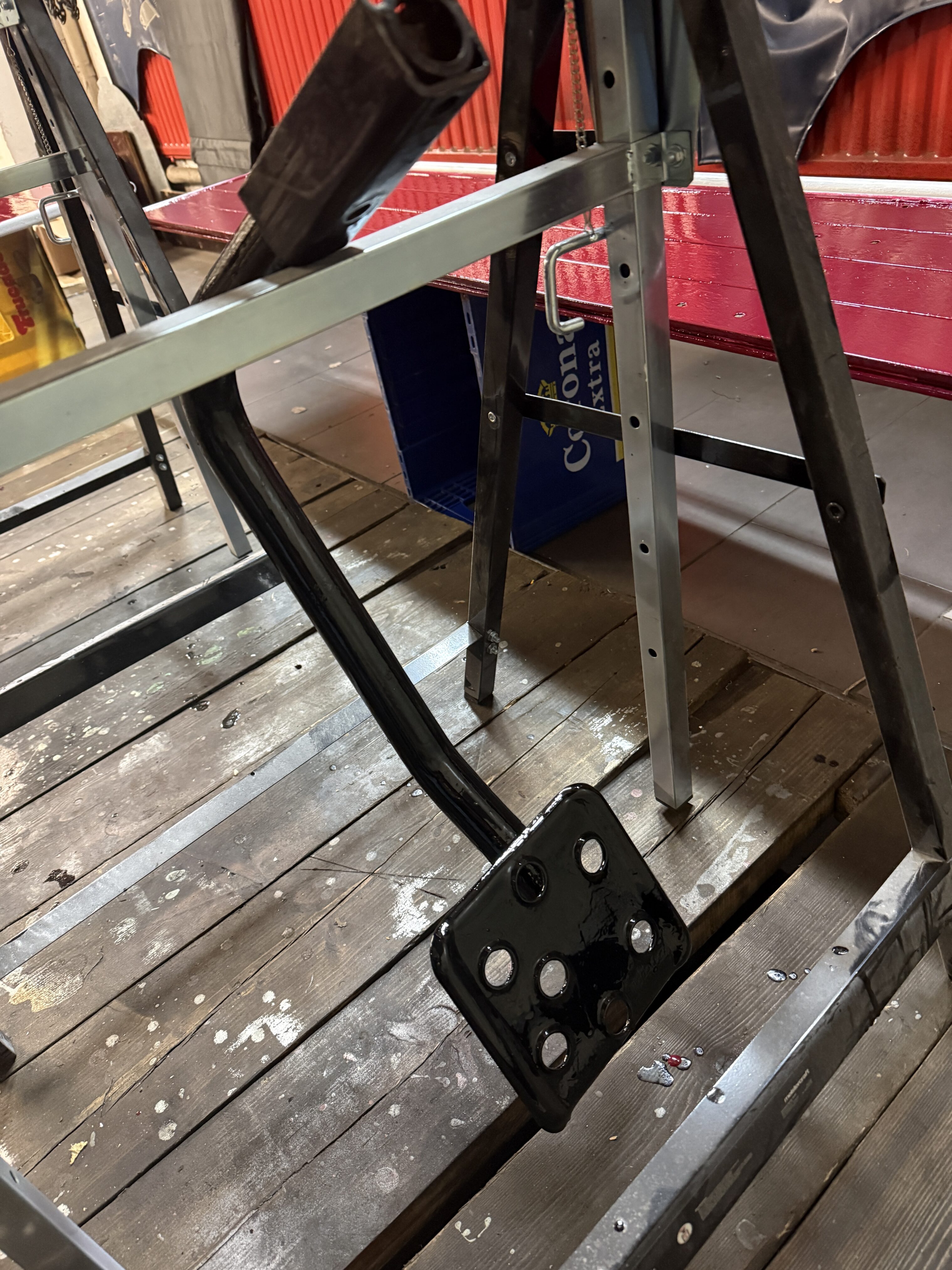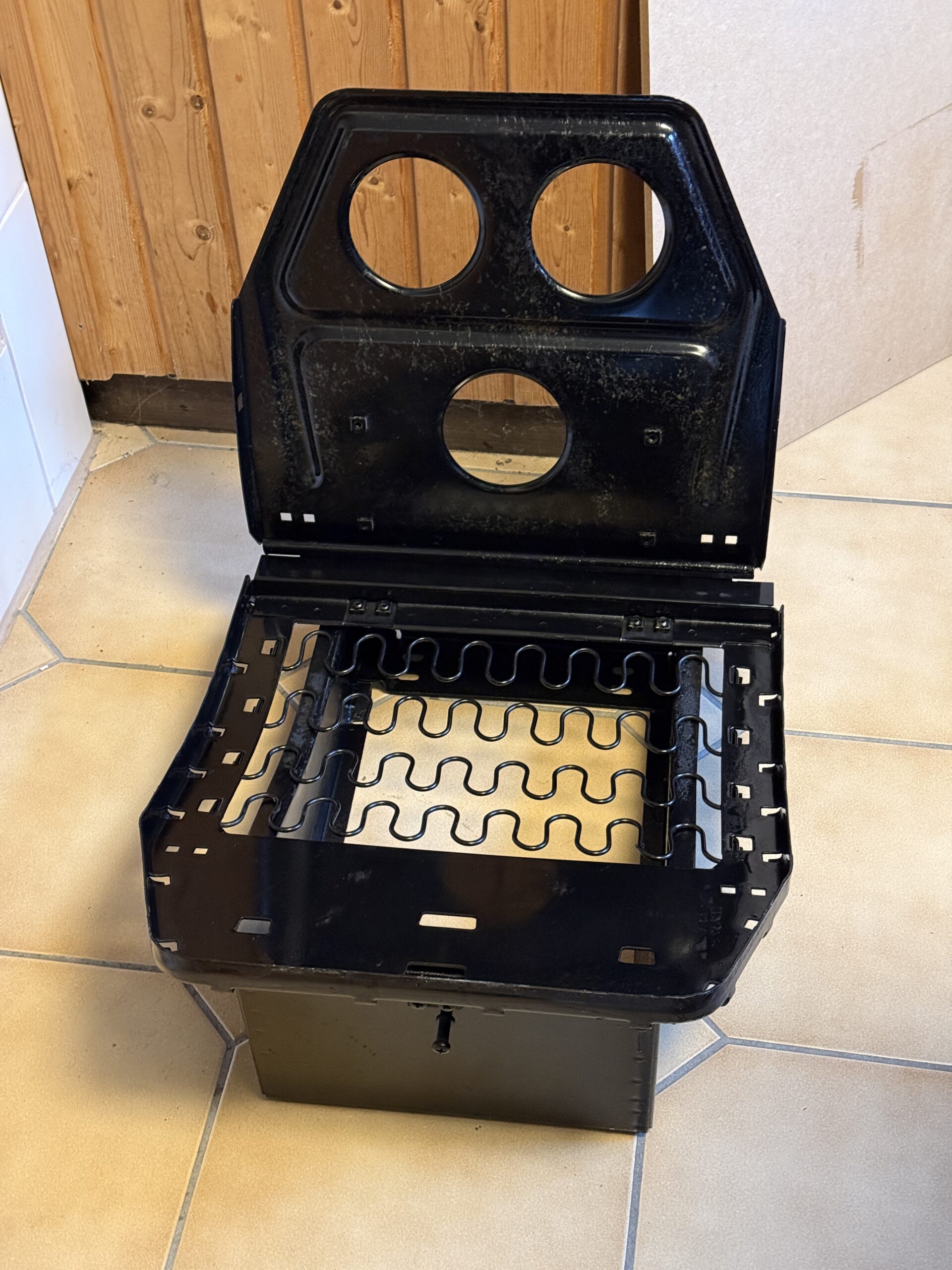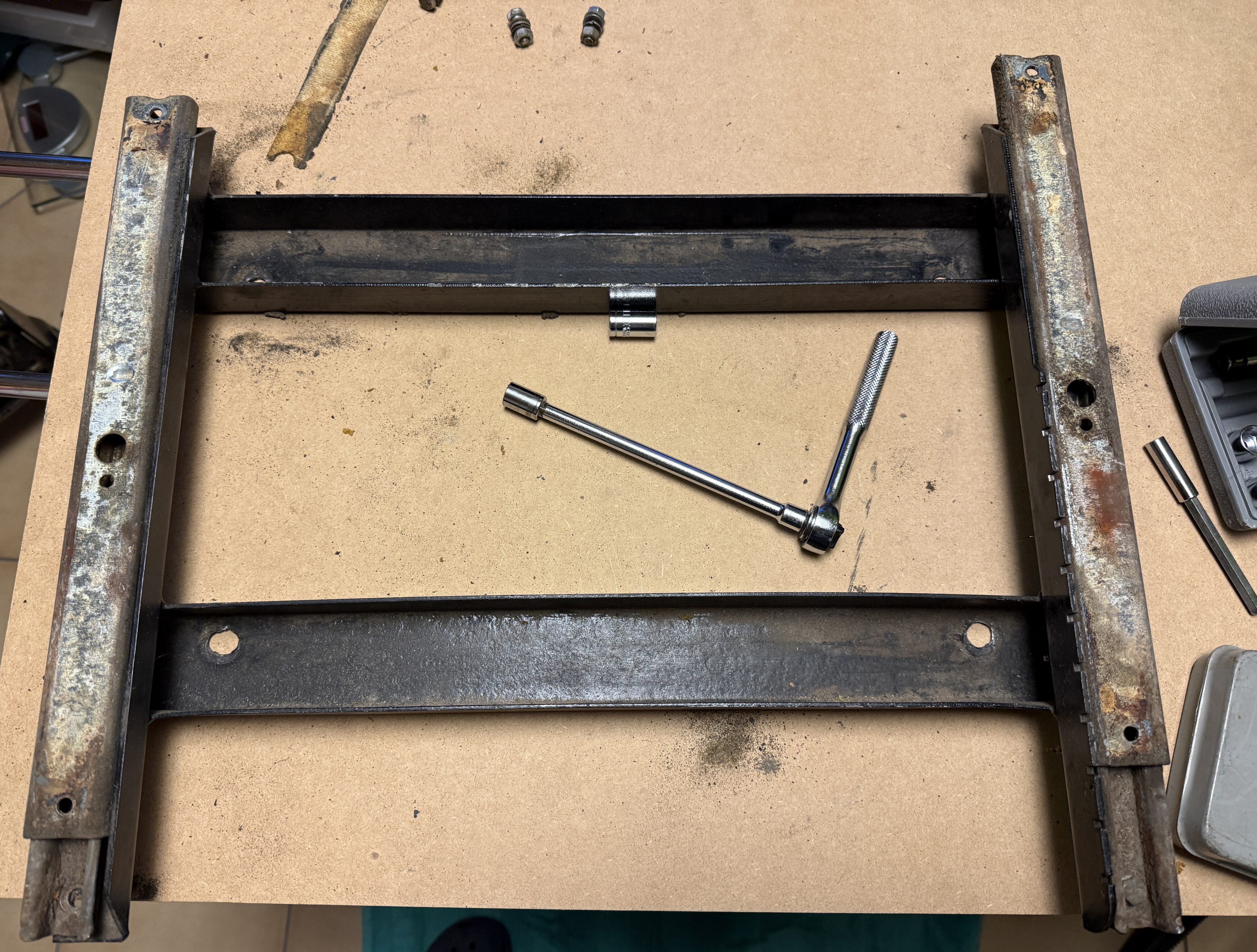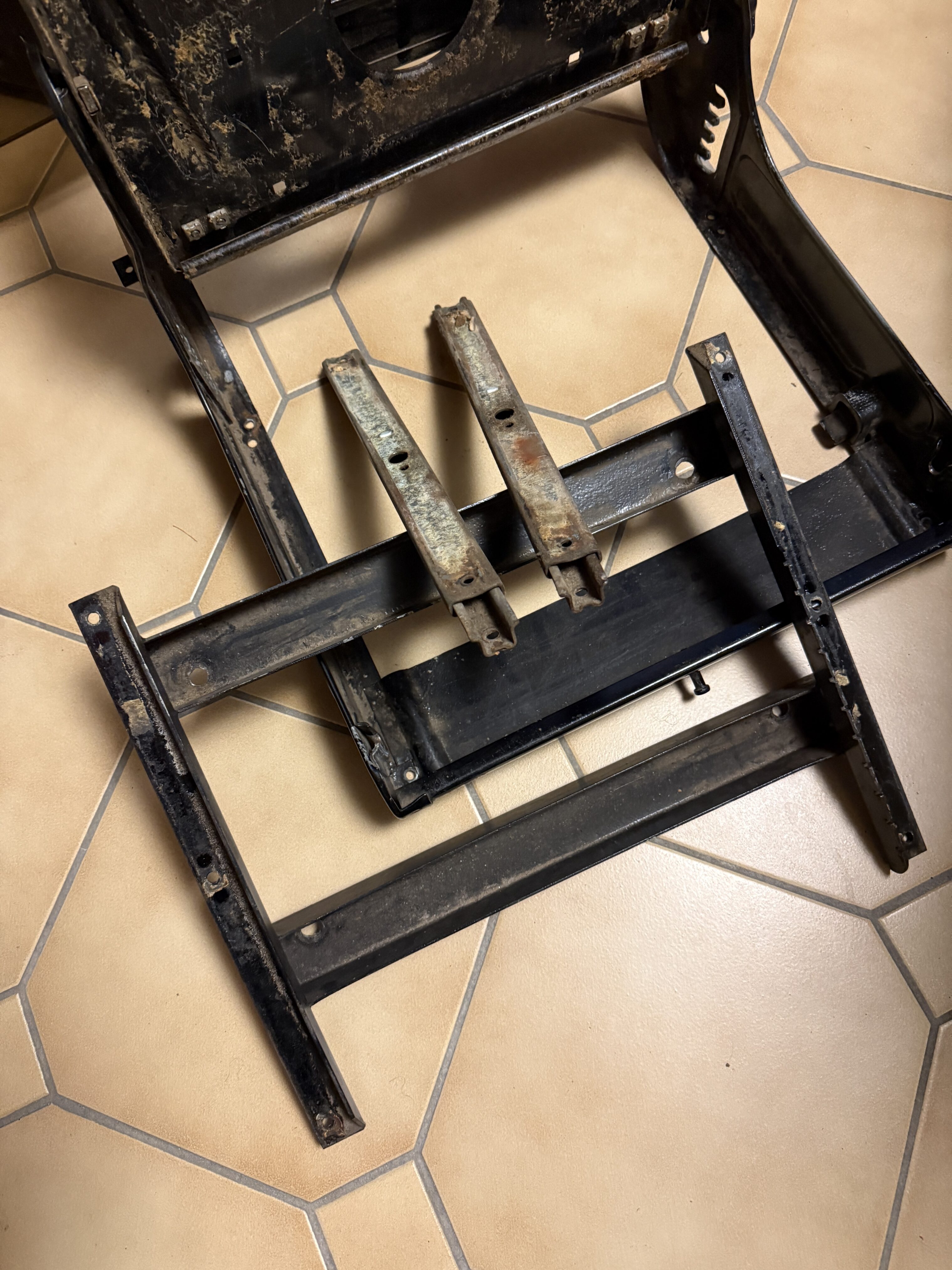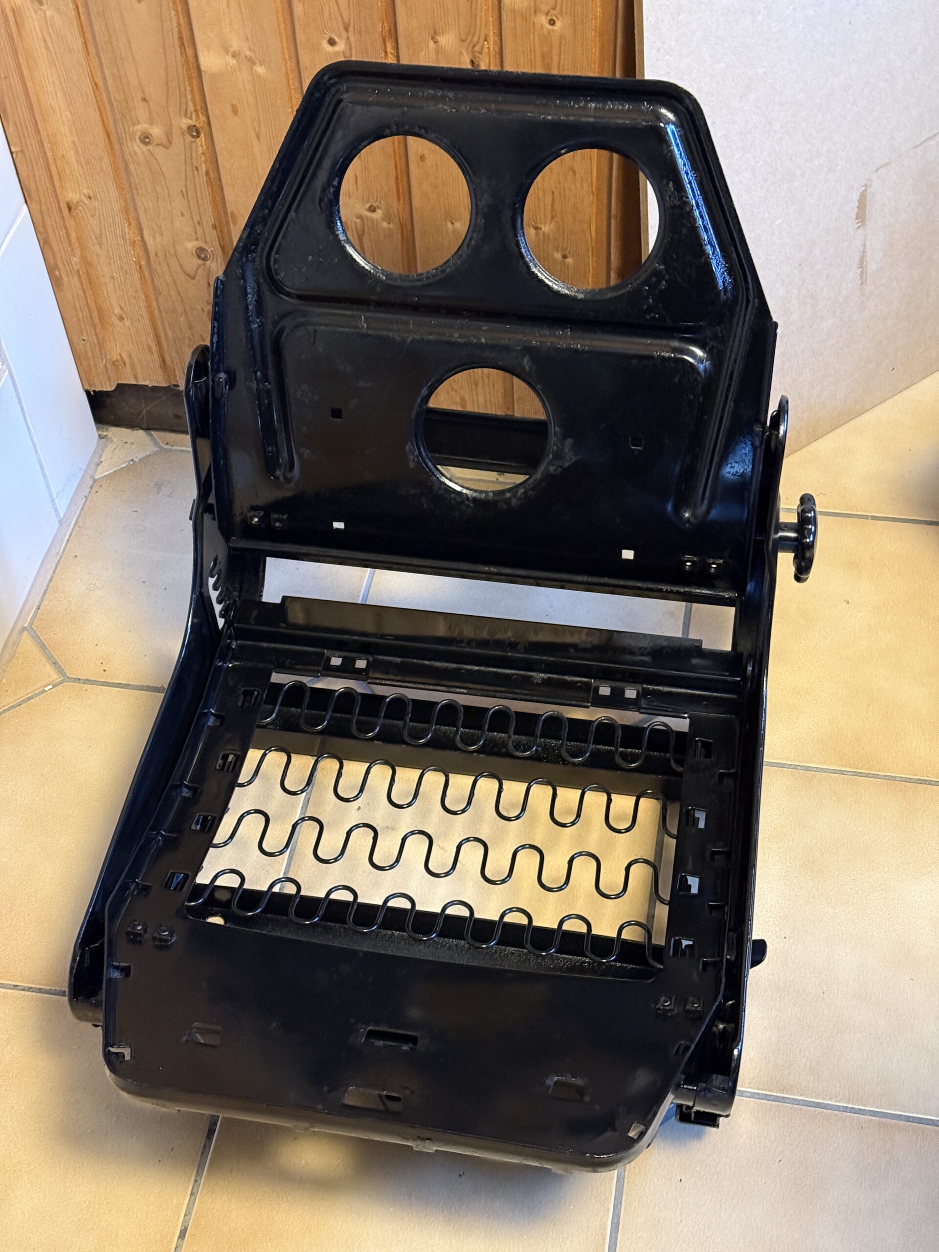 Die Sitzgestelle wurden inzwischen vollständig aufbereitet. Die Sitzschiene des Fahrersitzes wurde gereinigt und neu geschmiert und läuft nun wieder sehr leicht. Anschließend wurden die Gestelle lackiert. Die neuen Kunstlederbezüge sind bereits eingetroffen, allerdings fehlen noch die Schaumkerne, sodass die Sitze erst danach final fertiggestellt werden können.