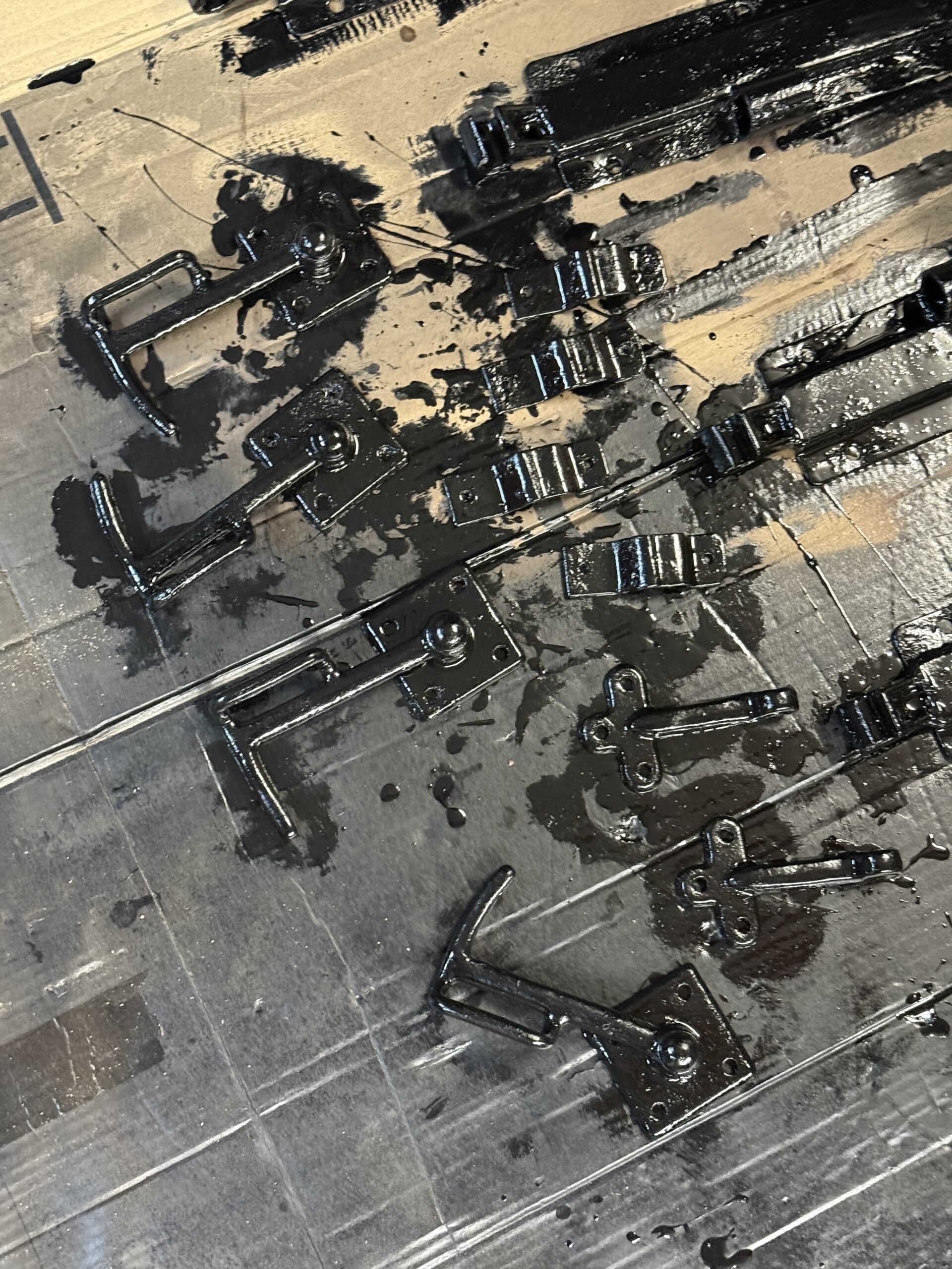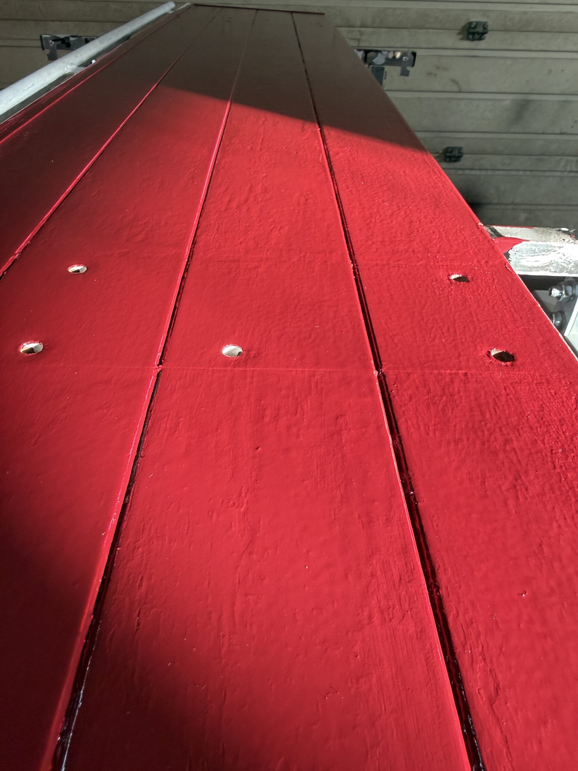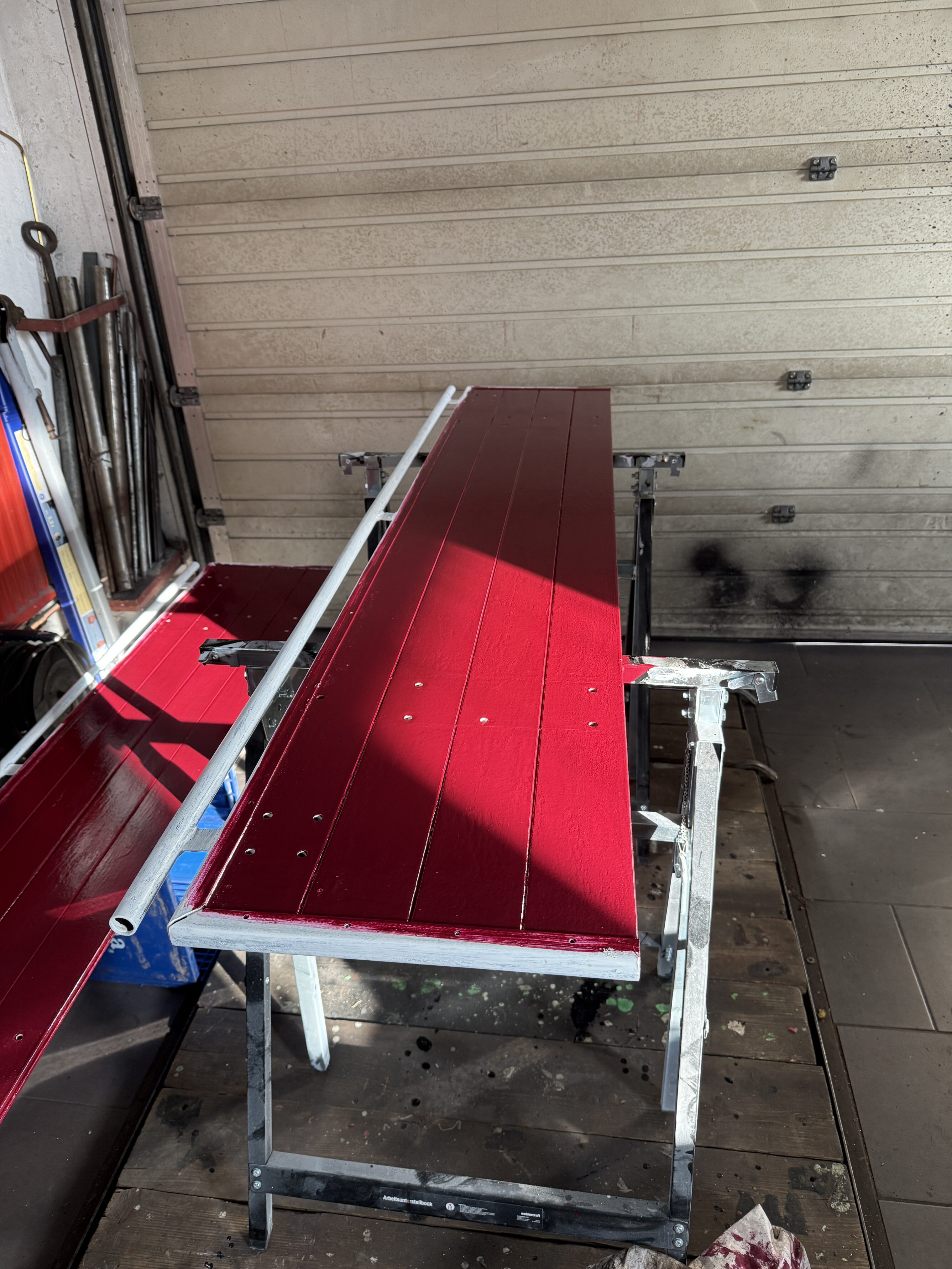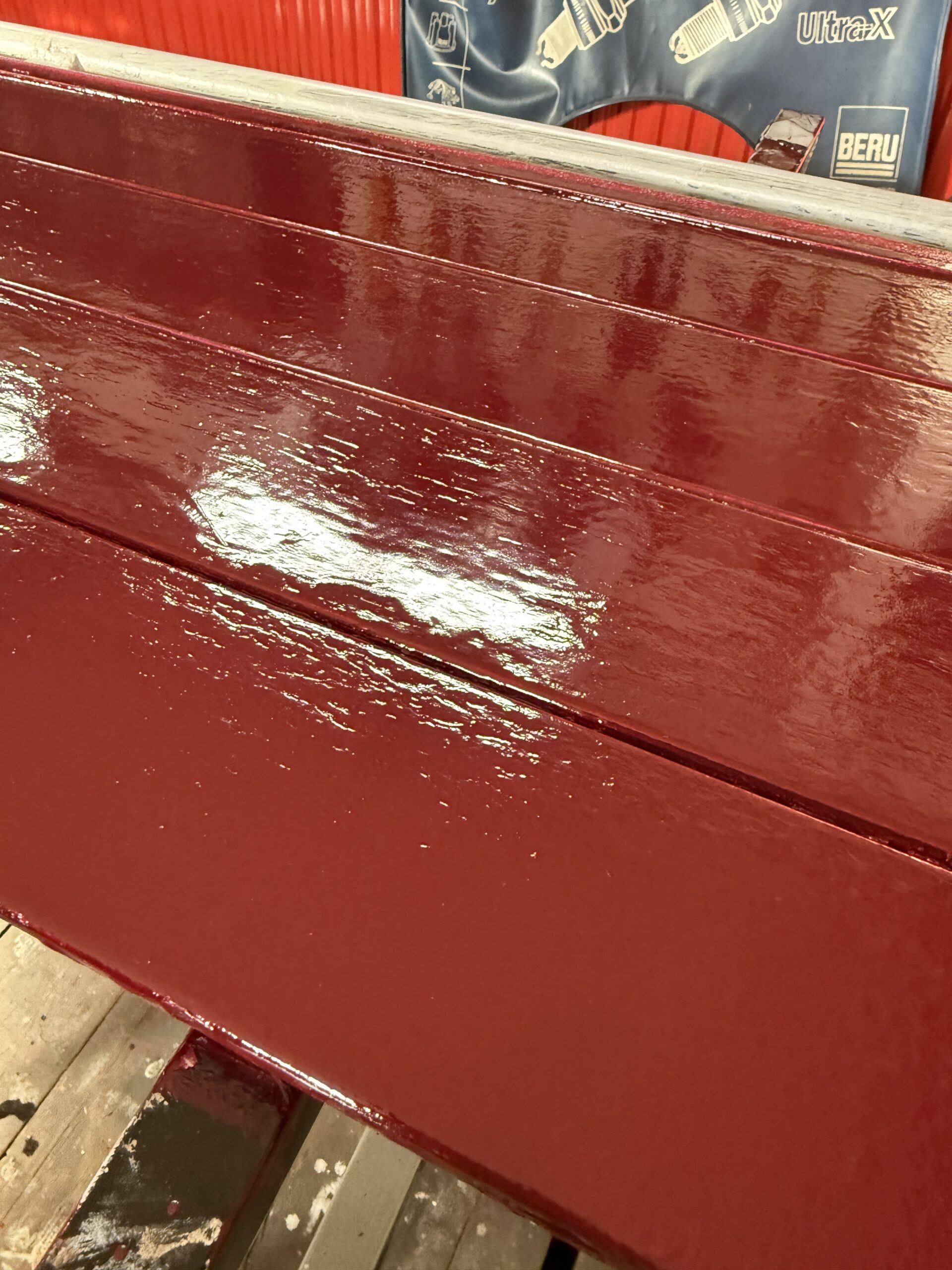 Mit der Lackierung der Bordwände im neuen Farbton RAL 3005 – Weinrot wurde begonnen, langsam zeigt sich damit die neue Hauptfarbe des Unimog. Auch die Beschläge wurden nach der Aufbereitung bereits lackiert. Sobald die Umrandungen der Bordwände ebenfalls in Schwarz fertiggestellt sind, können die Bordwände wieder zusammengebaut werden. Neue Schloss- und Zierschrauben aus Edelstahl sind bereits geliefert.