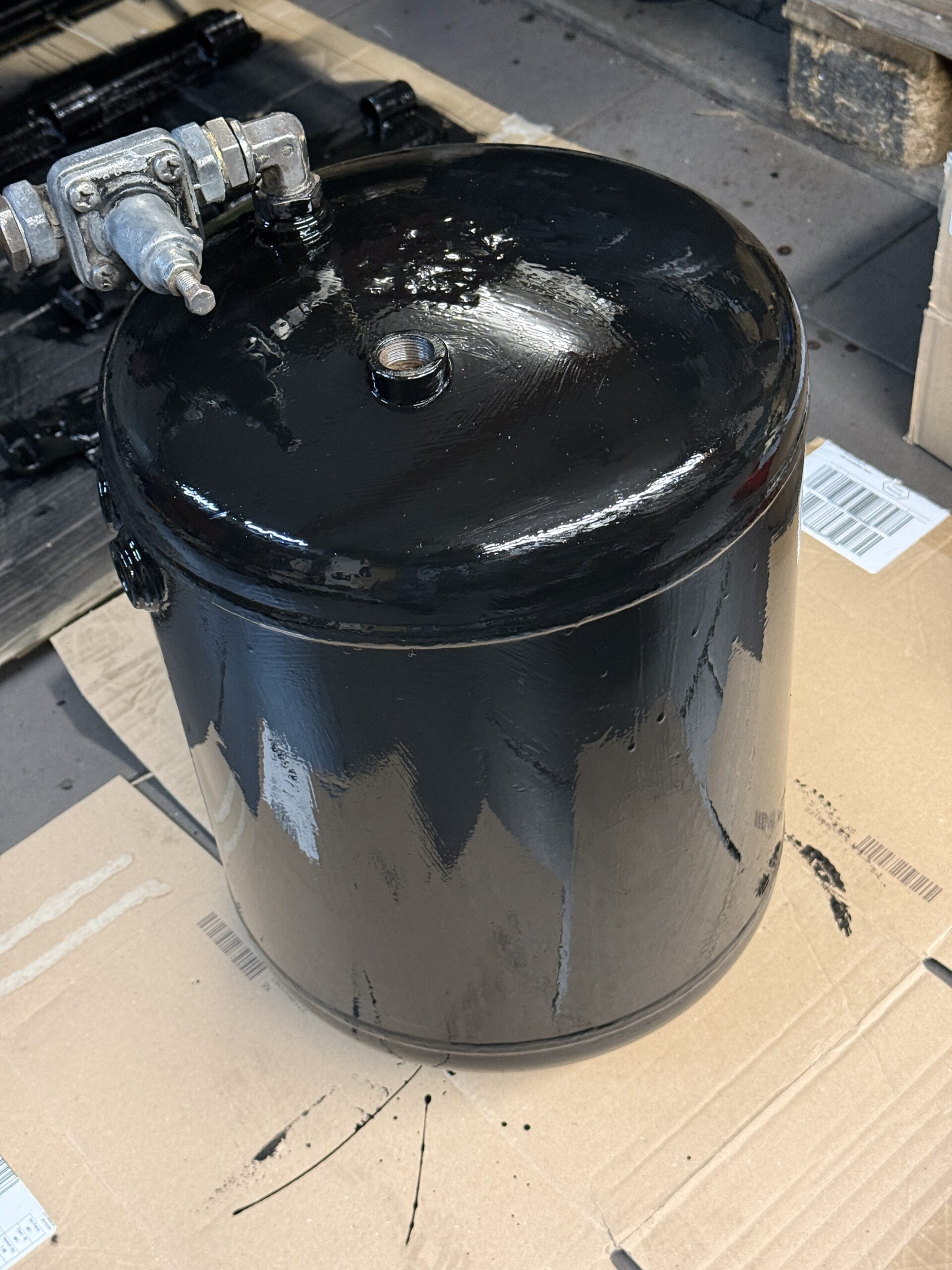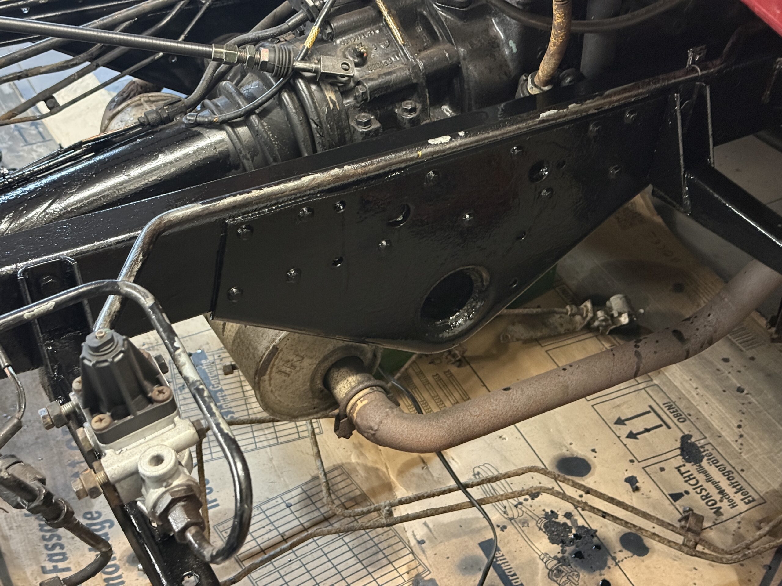 Weitere Anbauteile wie der große Lufttank und die Einstiegsbügel wurden aufbereitet und lackiert. Auch am Rahmen ging es weiter: Dieser ist nun bis auf Höhe des Fahrerhauses ebenfalls lackiert. Zudem wurden die Hinterachse inklusive Verteilergetriebe und Schubrohr bereits lackiert. Leitungen wie die Achsentlüftung wurden dabei gleich mitbehandelt. Die Bremsleitungen sowie die Luftleitungen bleiben vorerst noch außen vor, da sie derzeit noch überarbeitet werden.