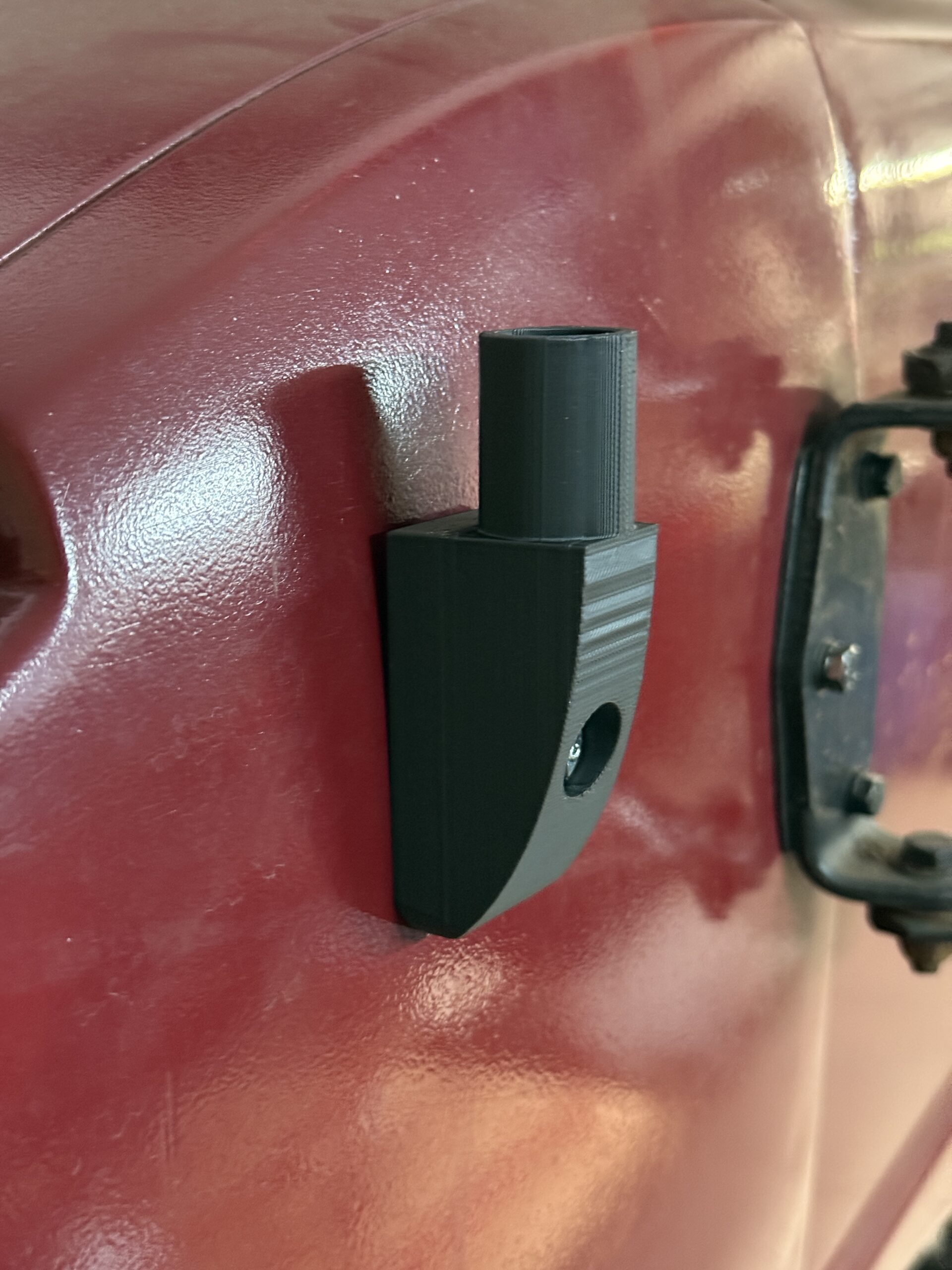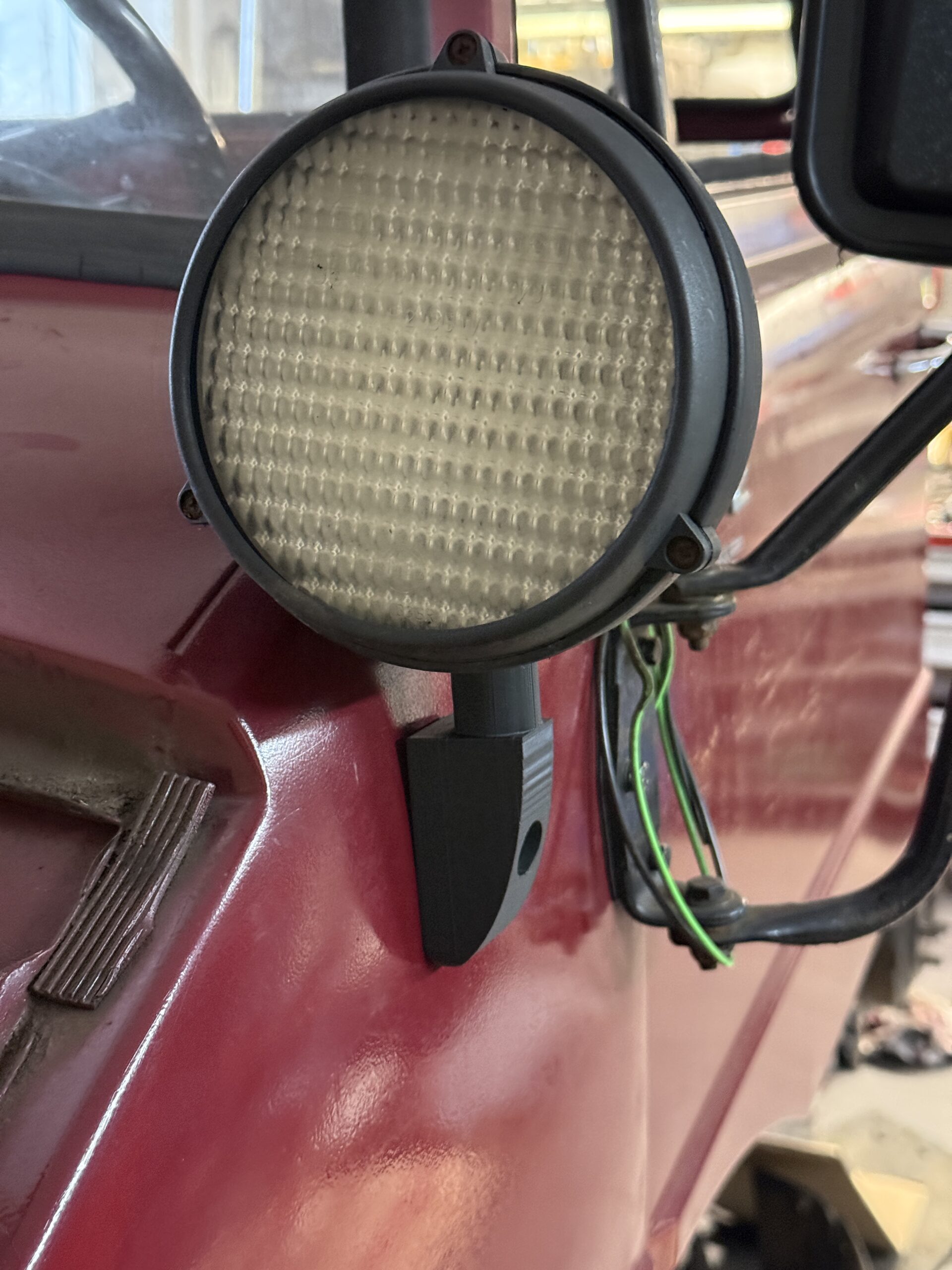 Der Befestigungsbereich für die Zusatzscheinwerfer wurde geöffnet, und das Muster der selbst gezeichneten und 3D-gedruckten Halterung passt wie geplant. Auch eine Probe mit den alten Zusatzscheinwerfern, die früher auf der Stoßstange montiert waren, verlief erfolgreich. Nun werden die beiden Halter final aus PETG gedruckt, damit sie später montiert werden können.