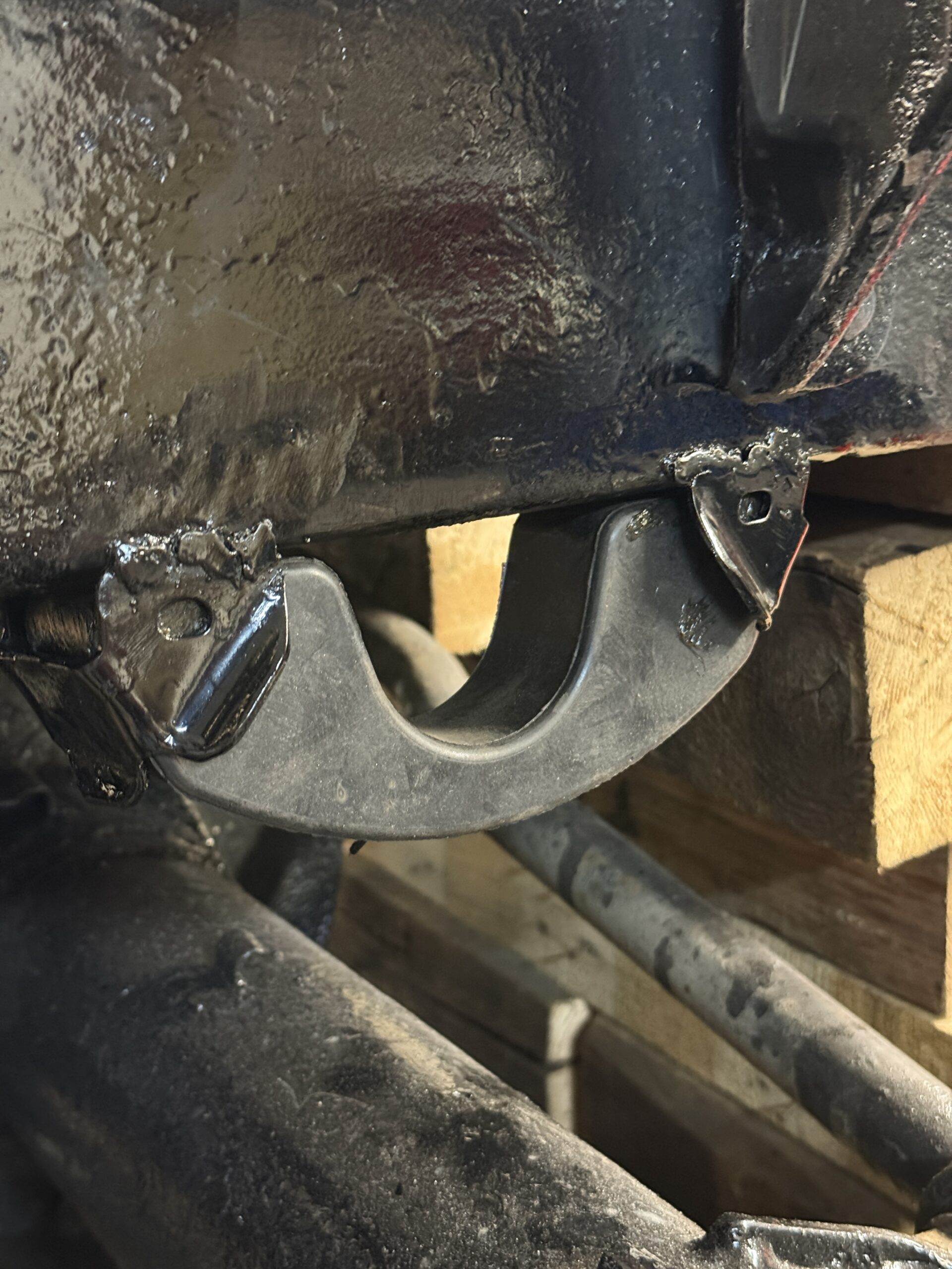 An der Karosserie ging es weiter: Die fehlende Achsdämpferhalterung wurde angeschweißt und ein neuer Achsdämpfer eingesetzt.